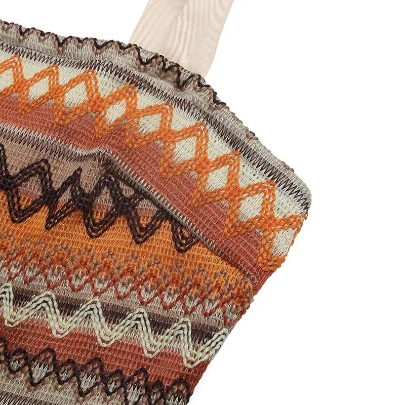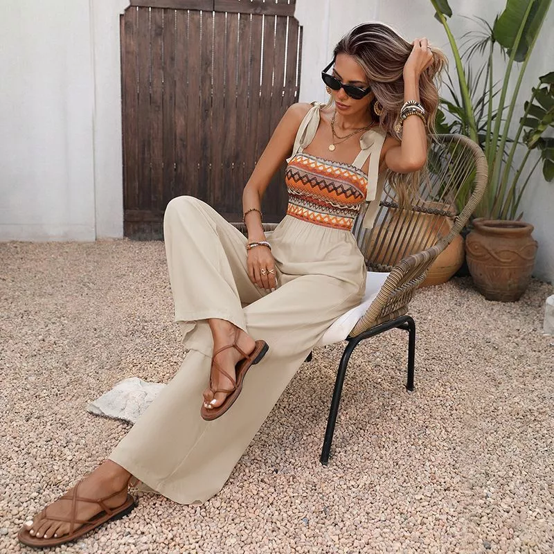 Tuta intera palazzo estiva in tonalità albicocca con corpetto fantasia etnica, perfetta per vacanze, weekend al mare e look estivi raffinati. Il bustino elasticizzato valorizza la silhouette con comfort e vestibilità adattabile, mentre il pantalone ampio e fluido dona movimento e leggerezza. Le spalline con fiocco aggiungono un dettaglio femminile e ricercato, rendendo questa tuta ideale per un outfit vacanza chic o per un aperitivo al tramonto.