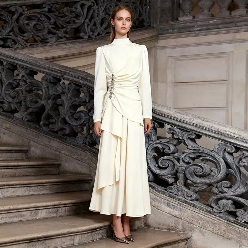 Abito Lungo Beige Sirena Ricamato Elegante Maniche Lunghe Look Cerimonia CF58937