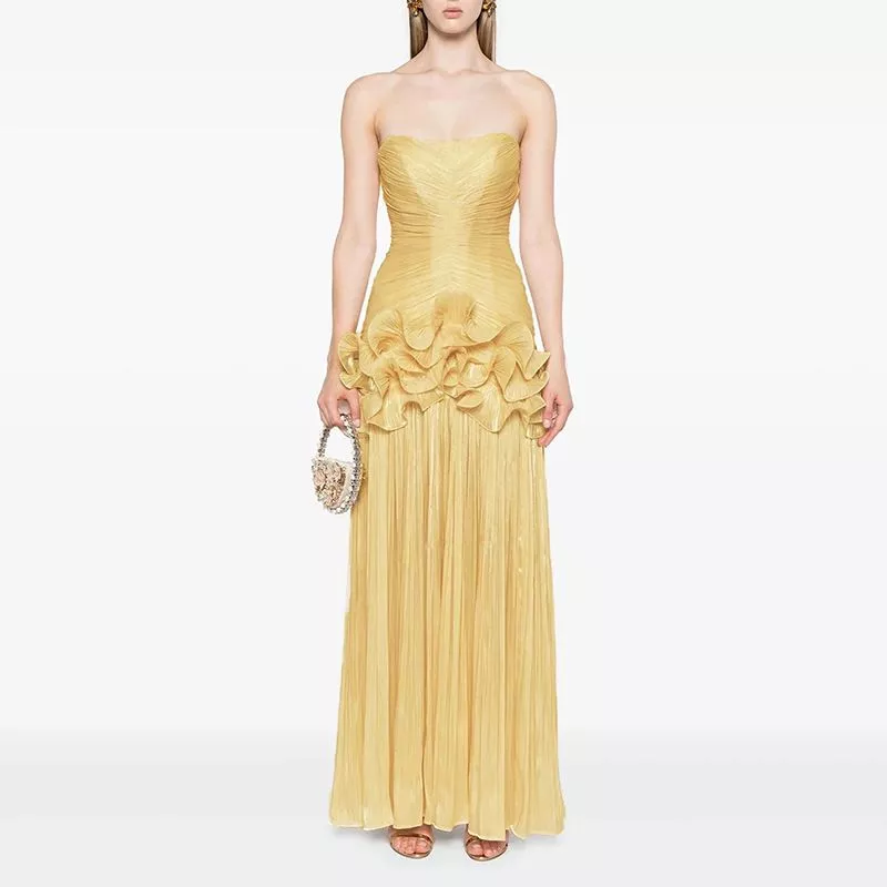 Abito Lungo Giallo Elegante Senza Spalline Balze Fascia Evento Sera CF58933