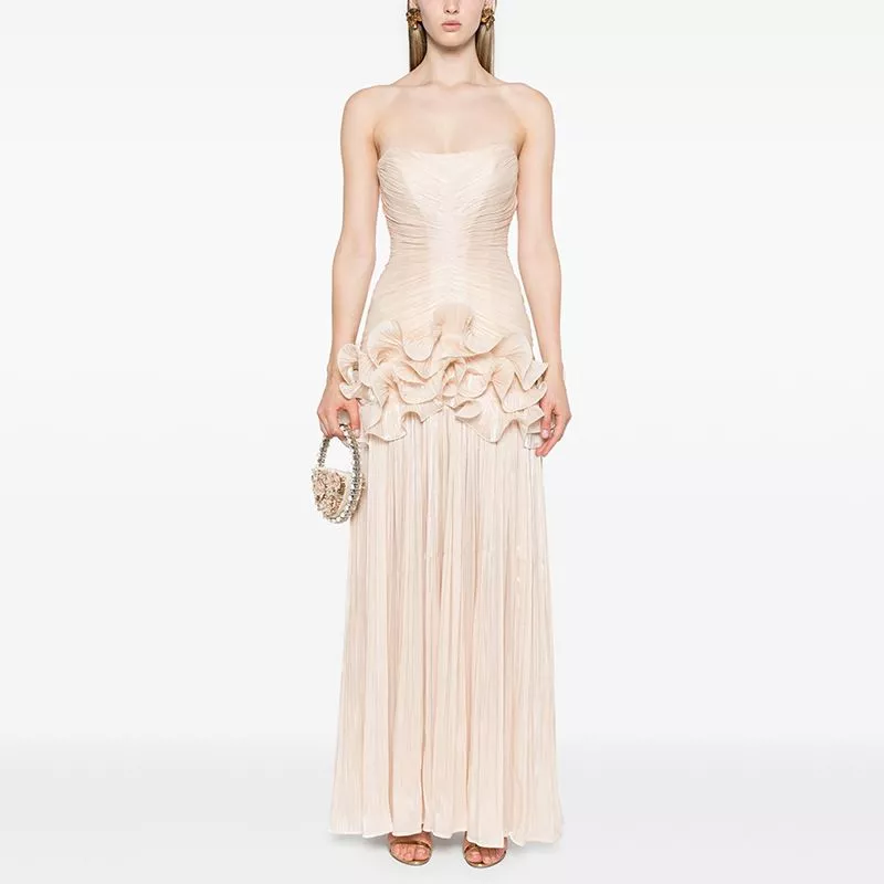 Abito Lungo Albicocca Elegante Senza Spalline Balze Floreali Sera EVento CF58933