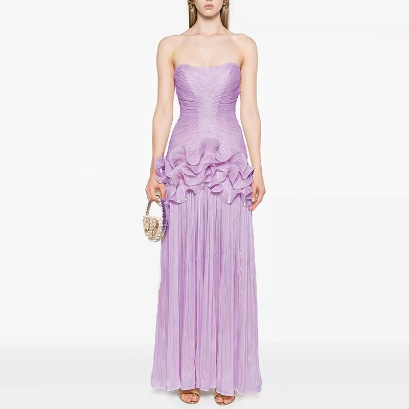 Abito Lungo Lilla Elegante Fascia Balze Floreali Evento Sera CF58933