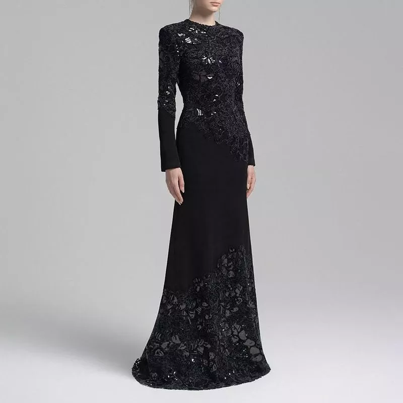 Abito Lungo Nero Sirena Ricamato Elegante Maniche Lunghe Look Cerimonia CF58937