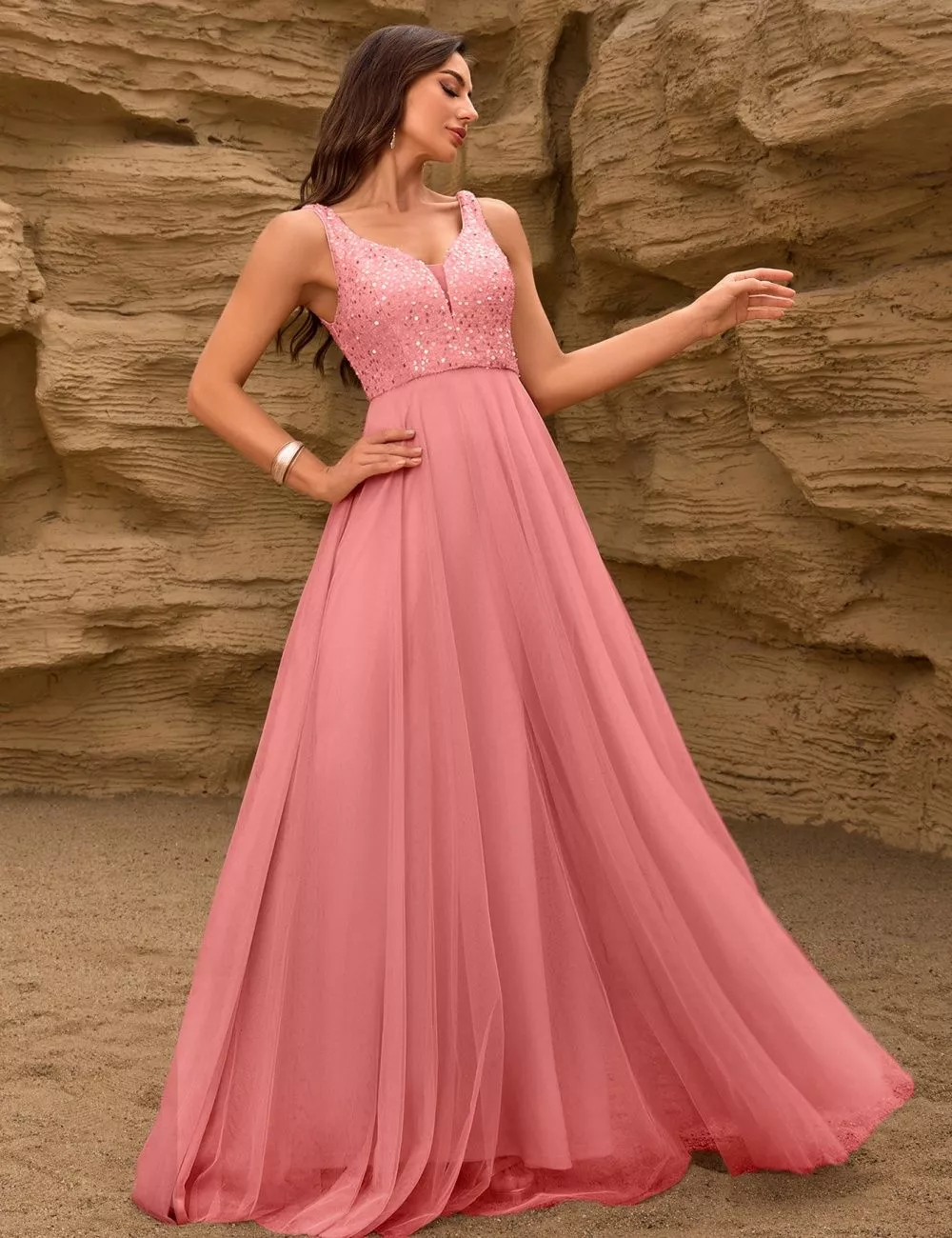 Abito Lungo Elegante Rosa Cipria In Tulle Corpino Ricamato Senza Maniche CF62808