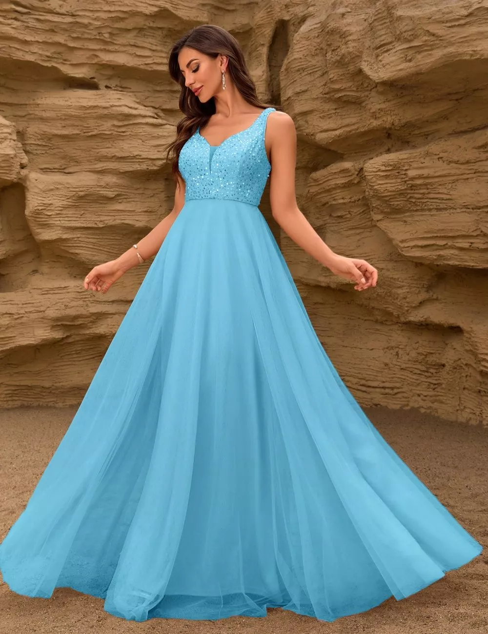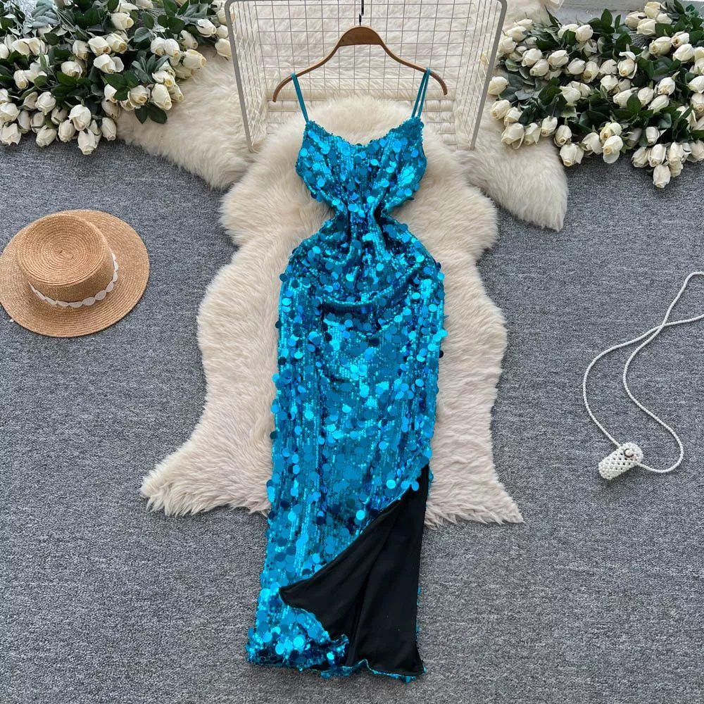 Abito Lungo Donna Turchese Con Spalline Paillettes E Spacco Sensuale CF64158