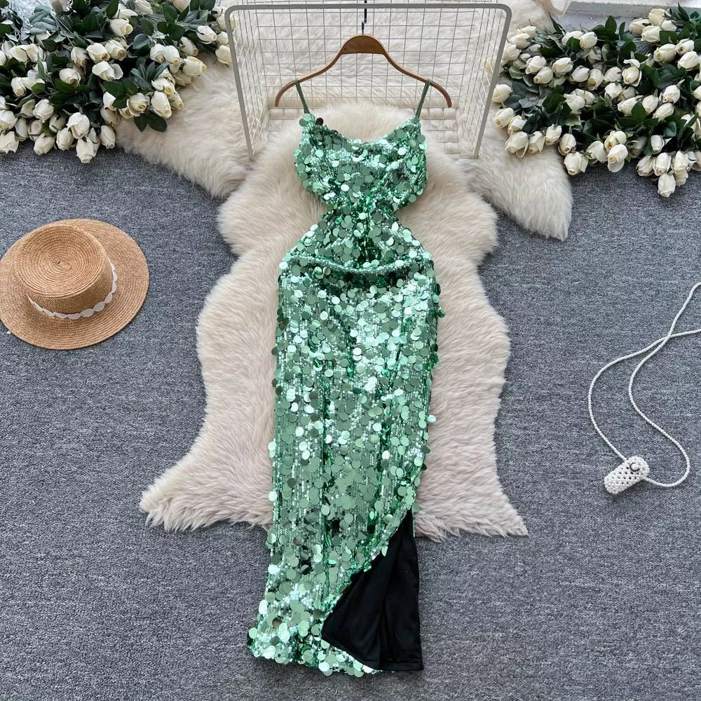 Abito Lungo Donna Verde Menta Con Spalline Paillettes E Spacco Elegante CF64158