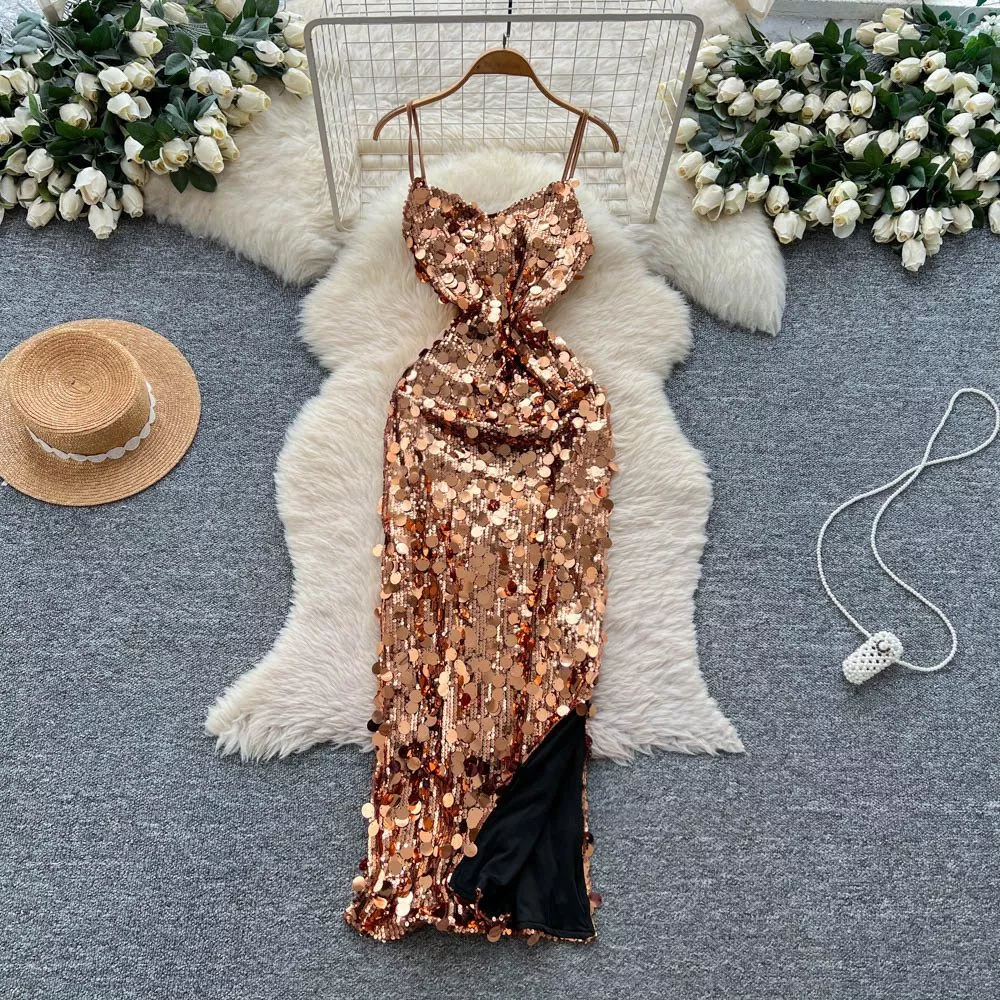 Abito Lungo Donna Champagne Con Spalline Paillettes E Spacco Raffinato CF64158