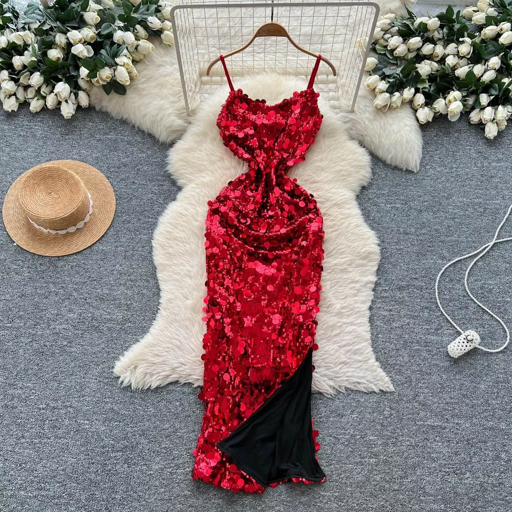 Abito Lungo Donna Rosso Con Spalline Paillettes E Spacco Da Sera CF64158