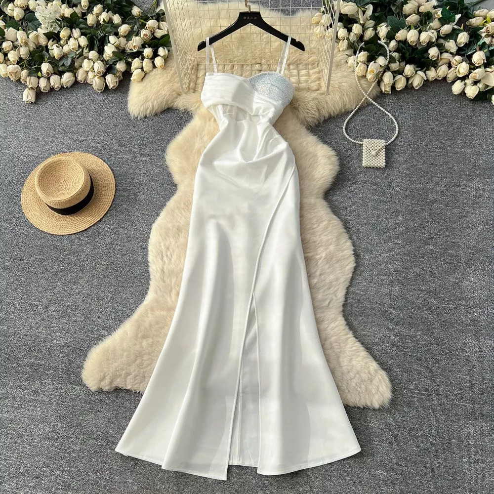 Vestito Da Sera Lungo Donna Raffinato Con Coppa Gioiello Spalline Bianco CF65444
