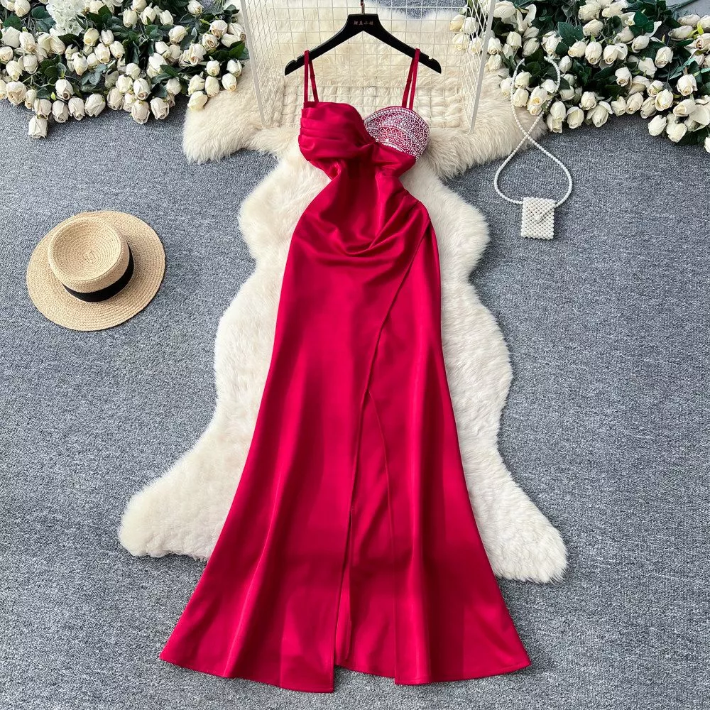 Abito Elegante Da Sera Donna Lungo Coppa Gioiello E Linea Fluida Rosso CF65444