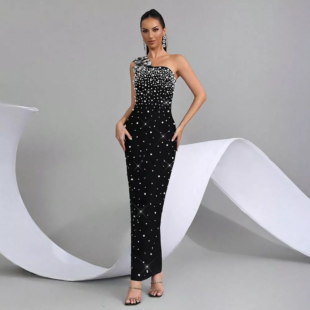 Abito Lungo Donna Elegante Monospalla Con Perle Decorative Nero CF65699