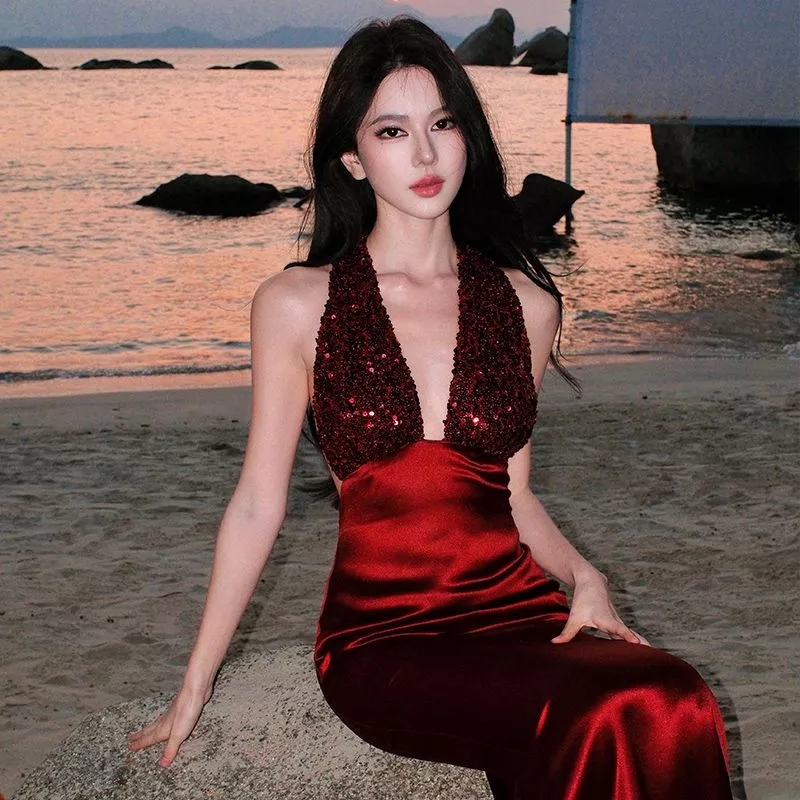 Vestito Sera Lungo Rosso Vino Halter Schiena Scoperta Elegante CF66628
