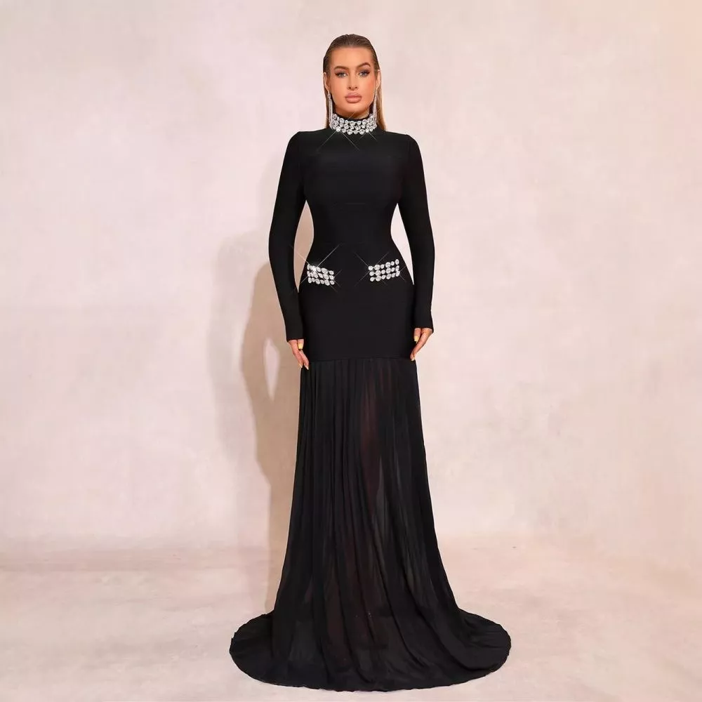 Vestito Lungo Nero Elegante Con Strass E Tulle Gala Sera Evento CF68074