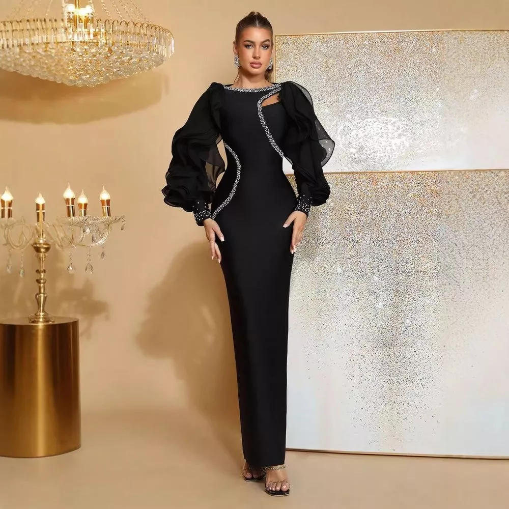 Vestito Nero Elegante Con Strass E Maniche Ampie Cerimonia Evento Sera CF68149