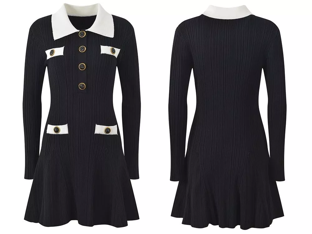 Vestito A Maglia A Coste Colletto A Contrasto E Bottoni Decorativi Nero CF61442