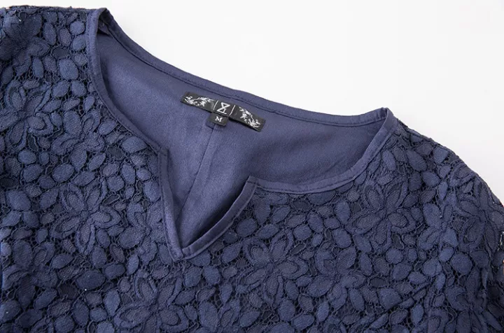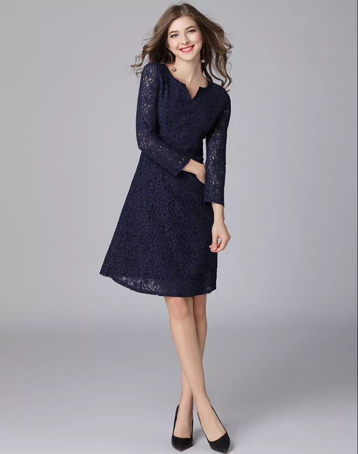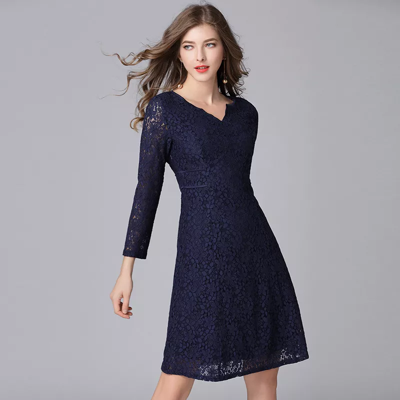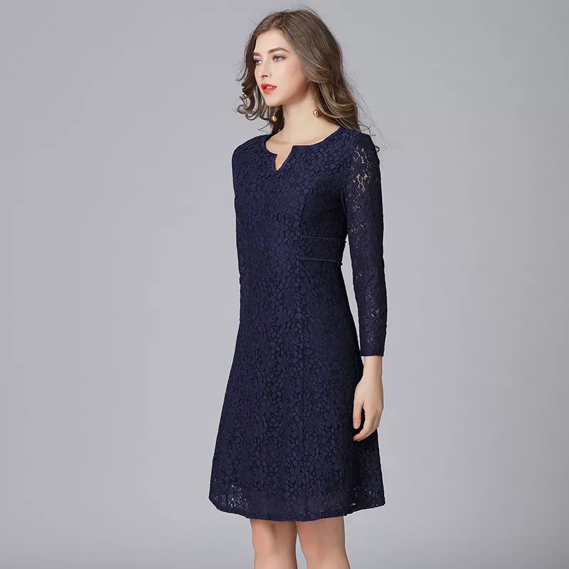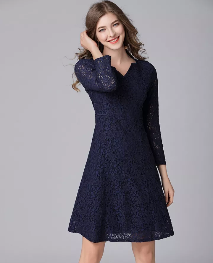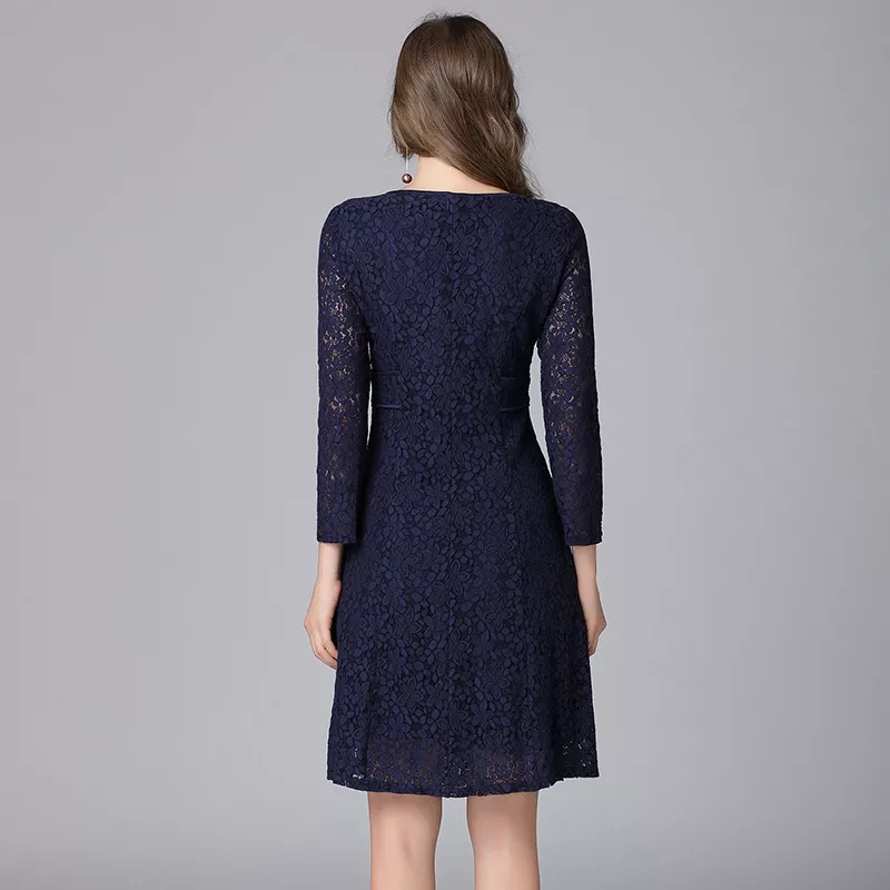 Vestito Abito Donna Corto Blu Notte Pizzo Manica Lunga Elegante Morbido 39772