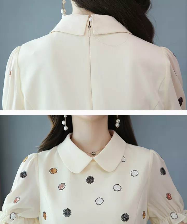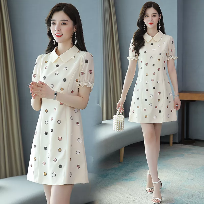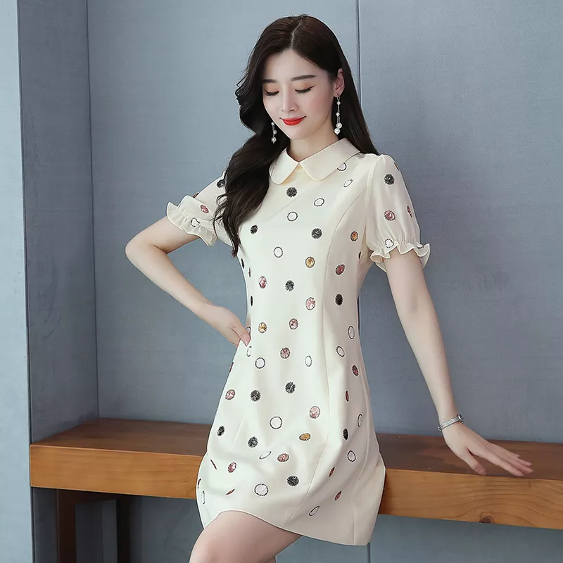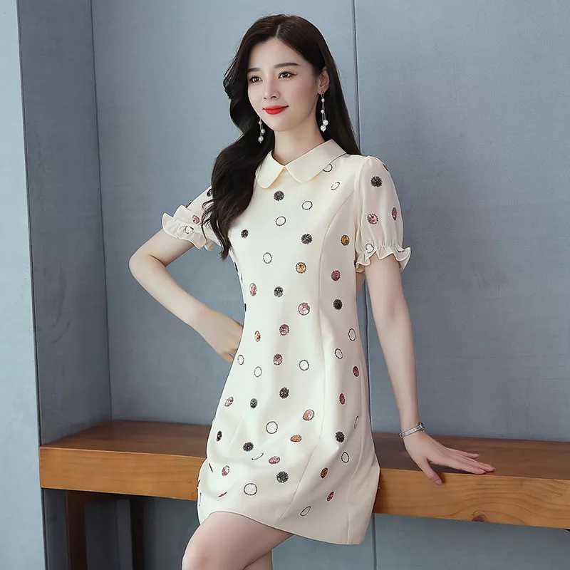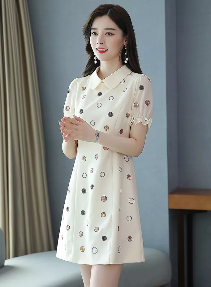 Vestito Abito Donna Corto Mini Elegante Beige Pois Colorati Raso 58050