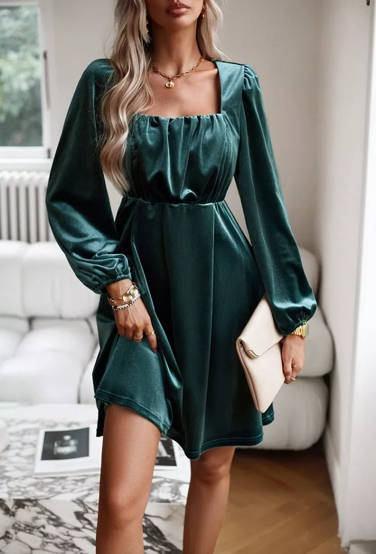 Vestito Abito Donna Corto Morbido Verde Velluto Svasato Elegante Chic 79109