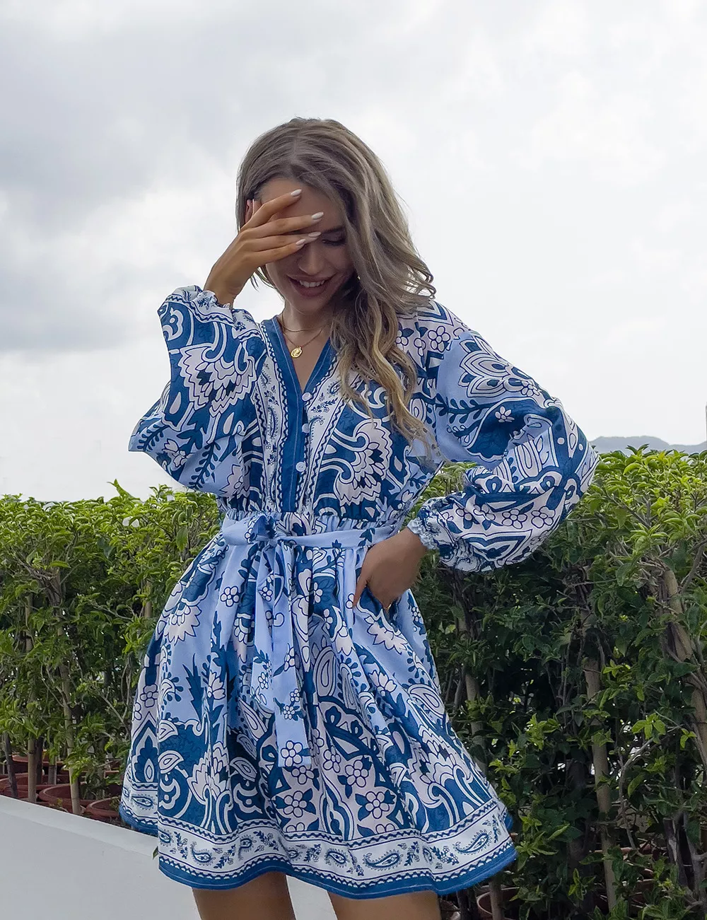 vestito abito donna elegante corto manica lunga chiffon blu cintura raso 33459
