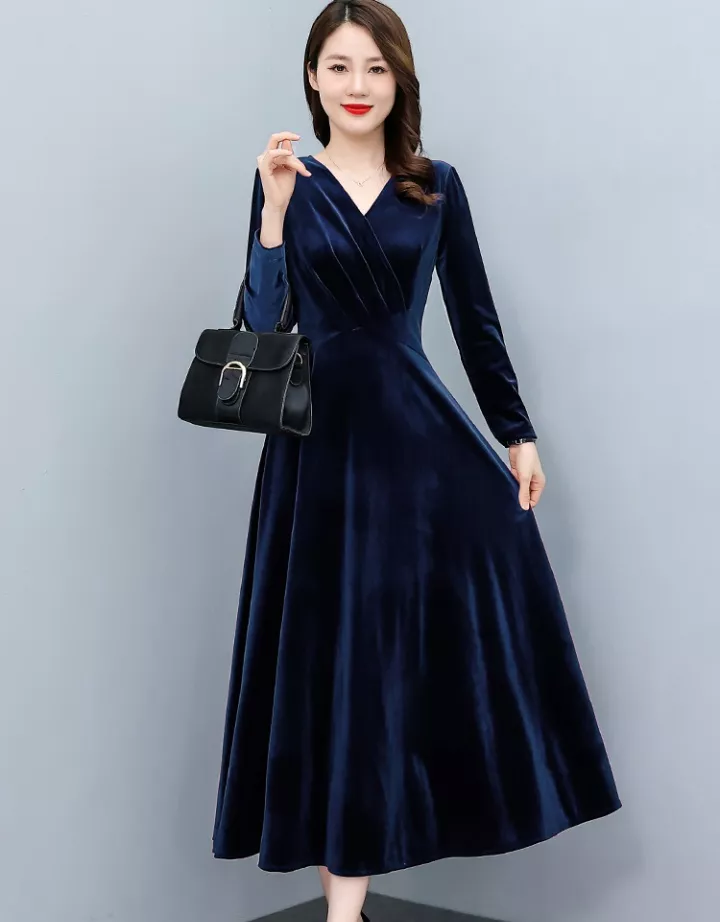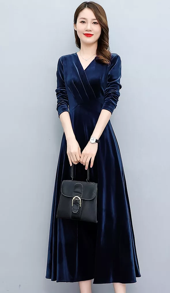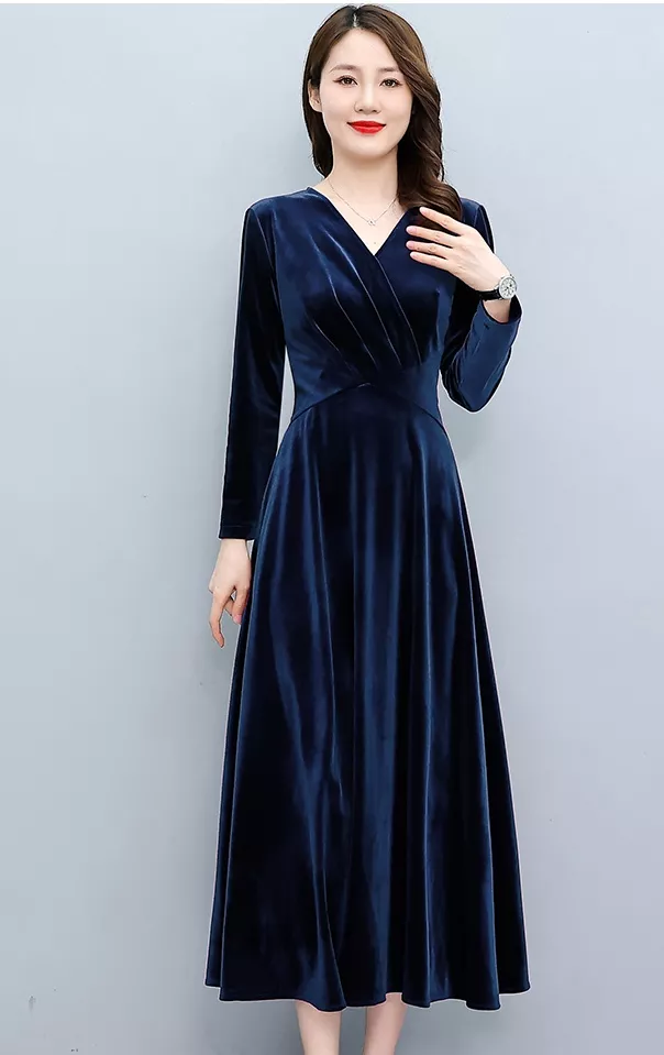 Vestito Abito Elegante Lungo Elegante Blu Velluto Elegante Raso 42294