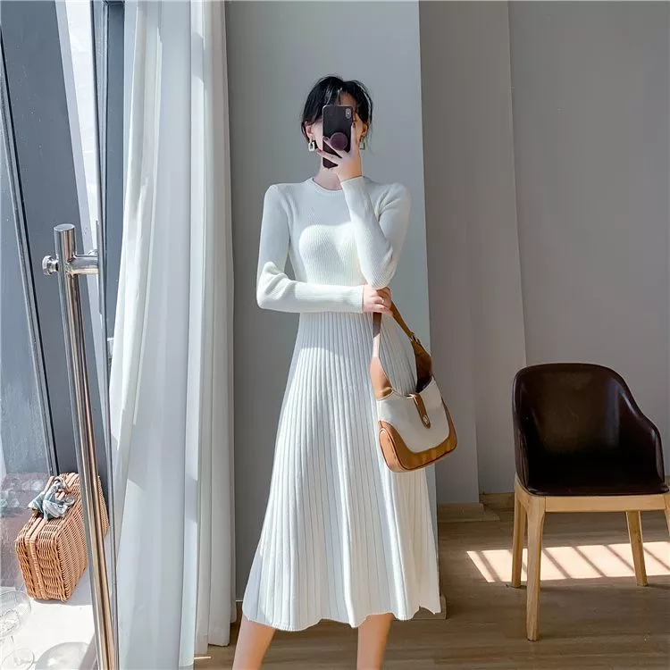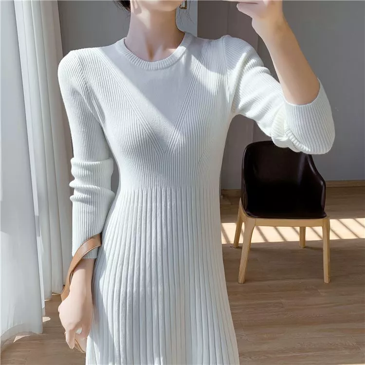 Vestito Abito Elegante Lungo Elegante Morbido Maglia Coste Bianco 78977
