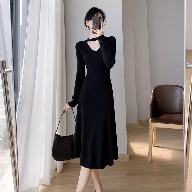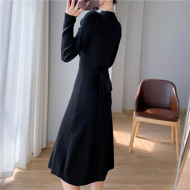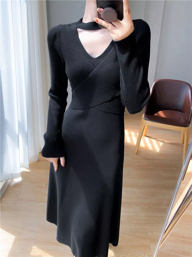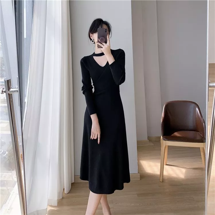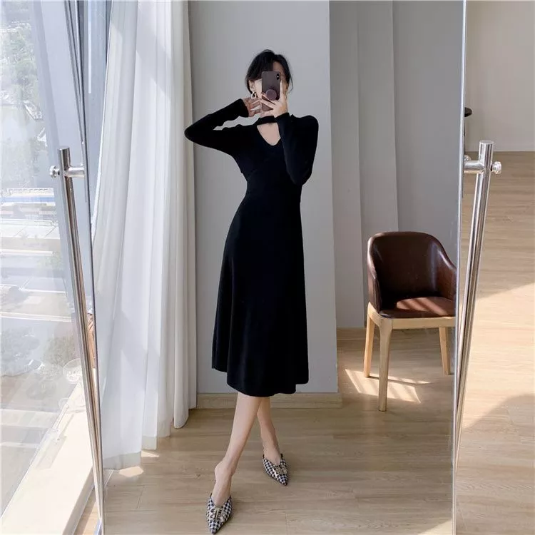 Vestito Abito Elegante Lungo Elegante Morbido Maglia Coste Nero Over 78974