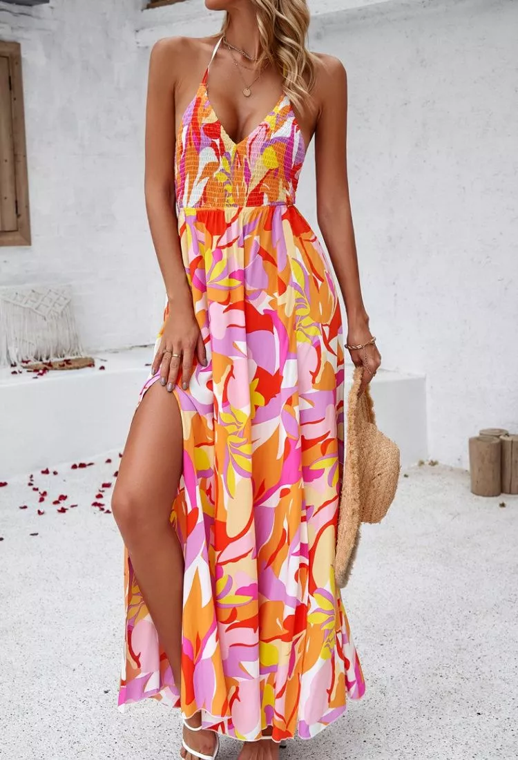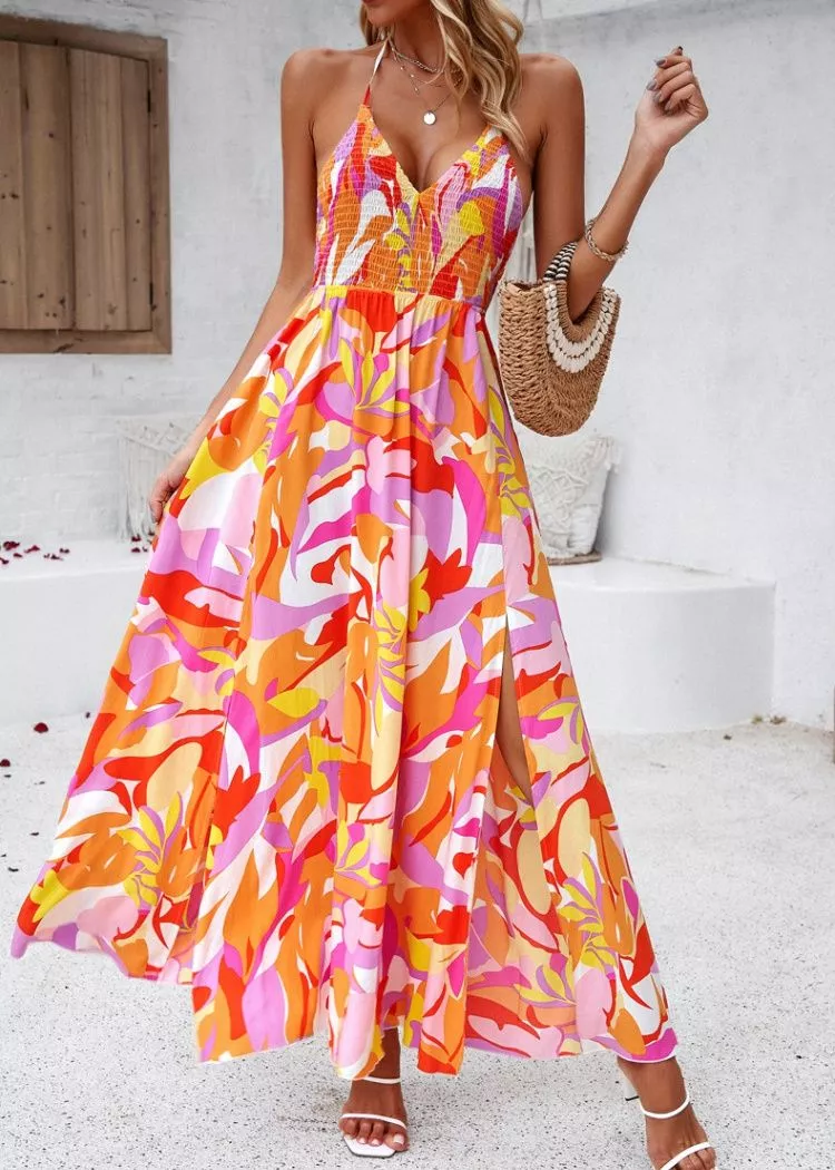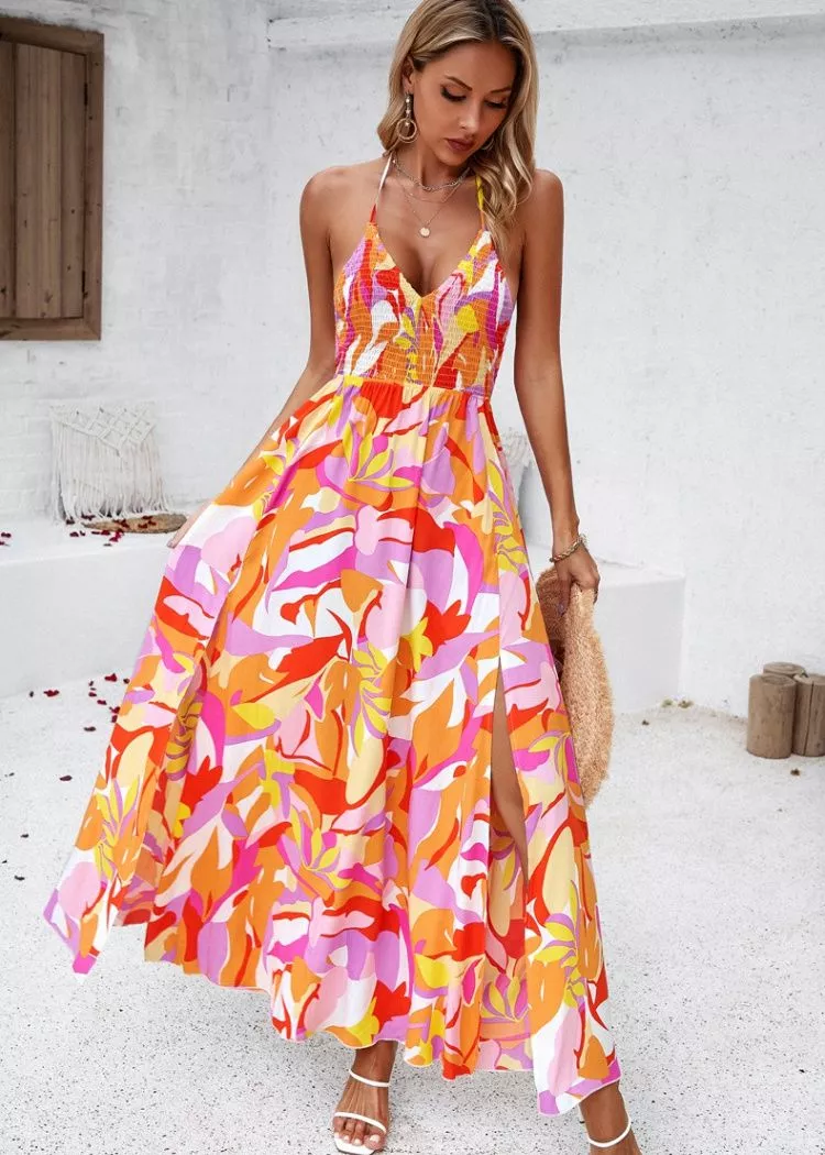Vestito Abito Elegante Lungo Elegante Raso Boho Chic Rosa Spacco Colorato 01153