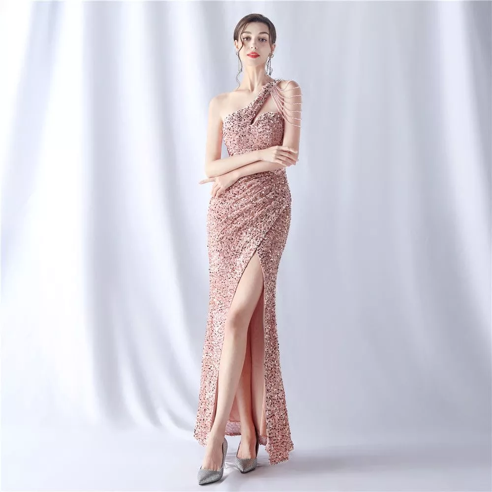 Vestito Abito Elegante Lungo Evento Sera Rosa Spacco Strass Morbido 90013