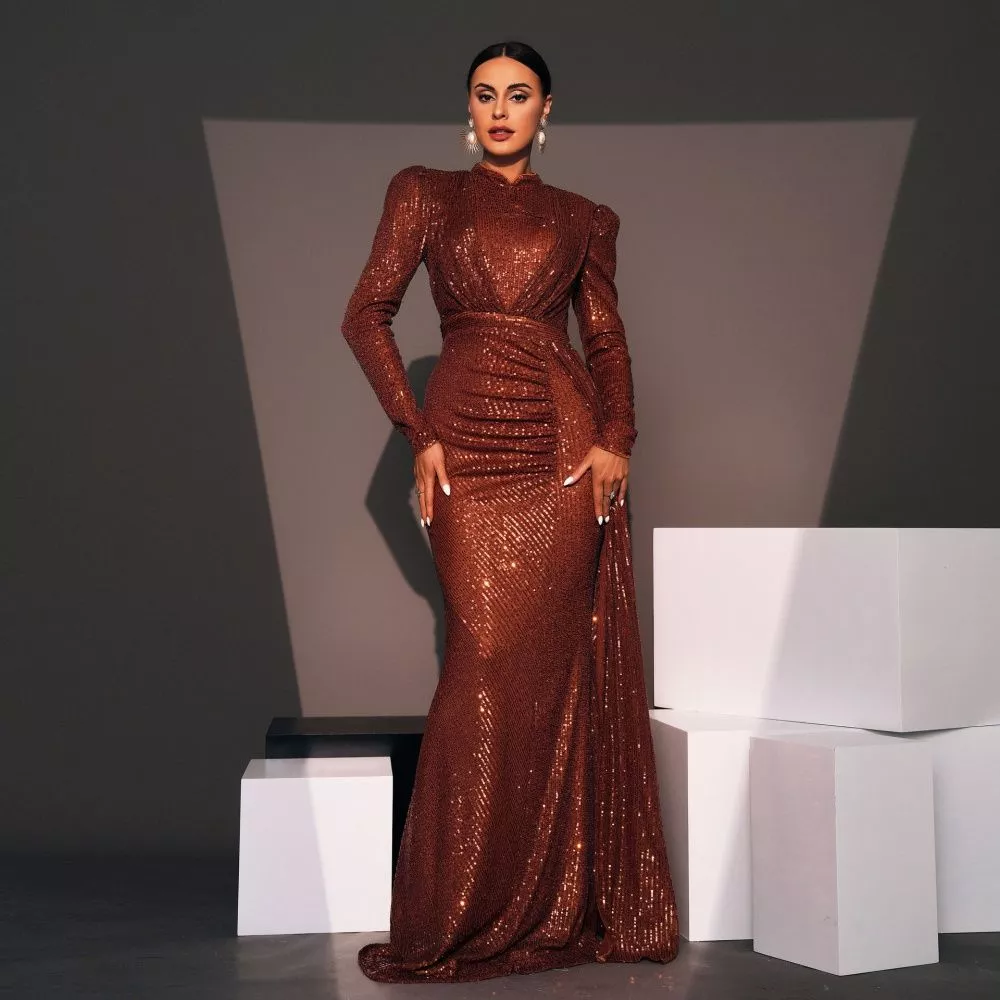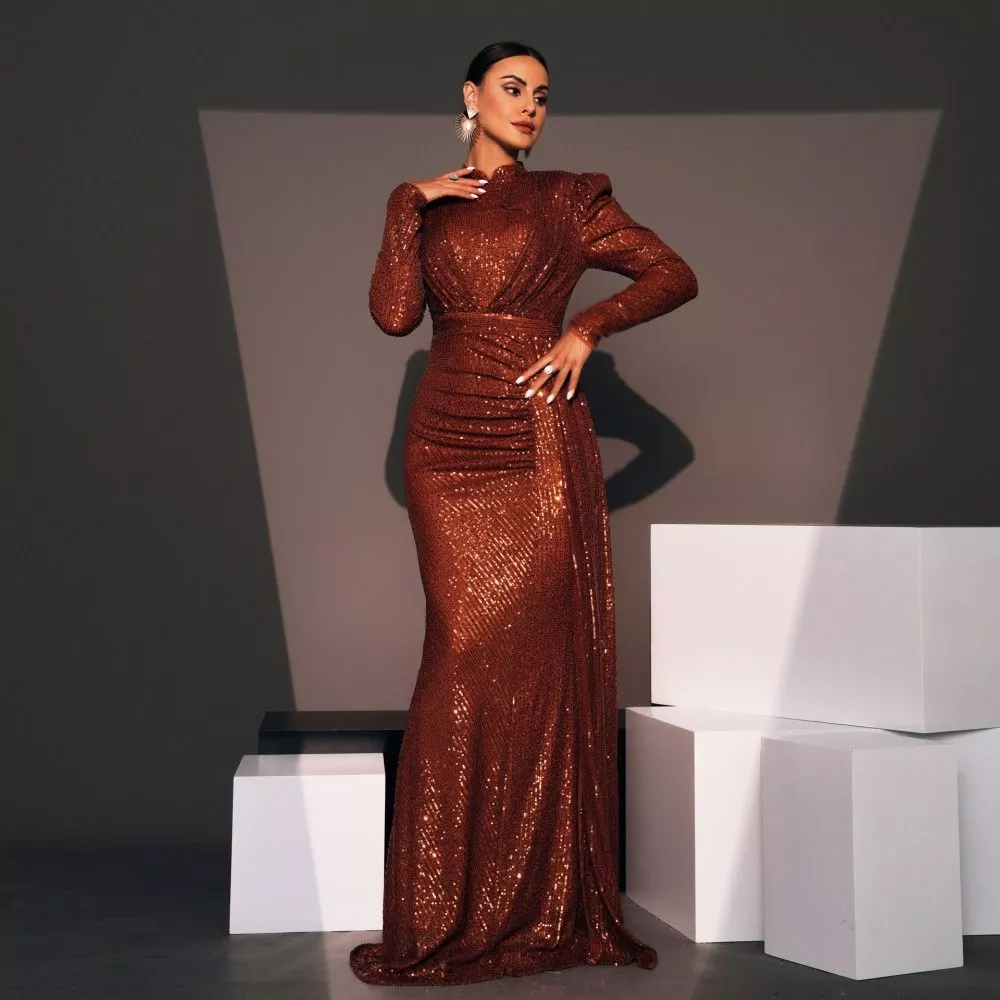 Vestito Abito Elegante Lungo Strass Marrone Bronzo Sera Evento Cerimonia 11379