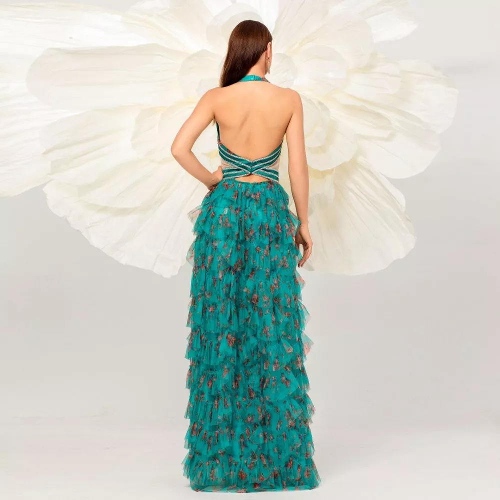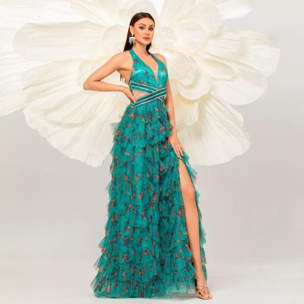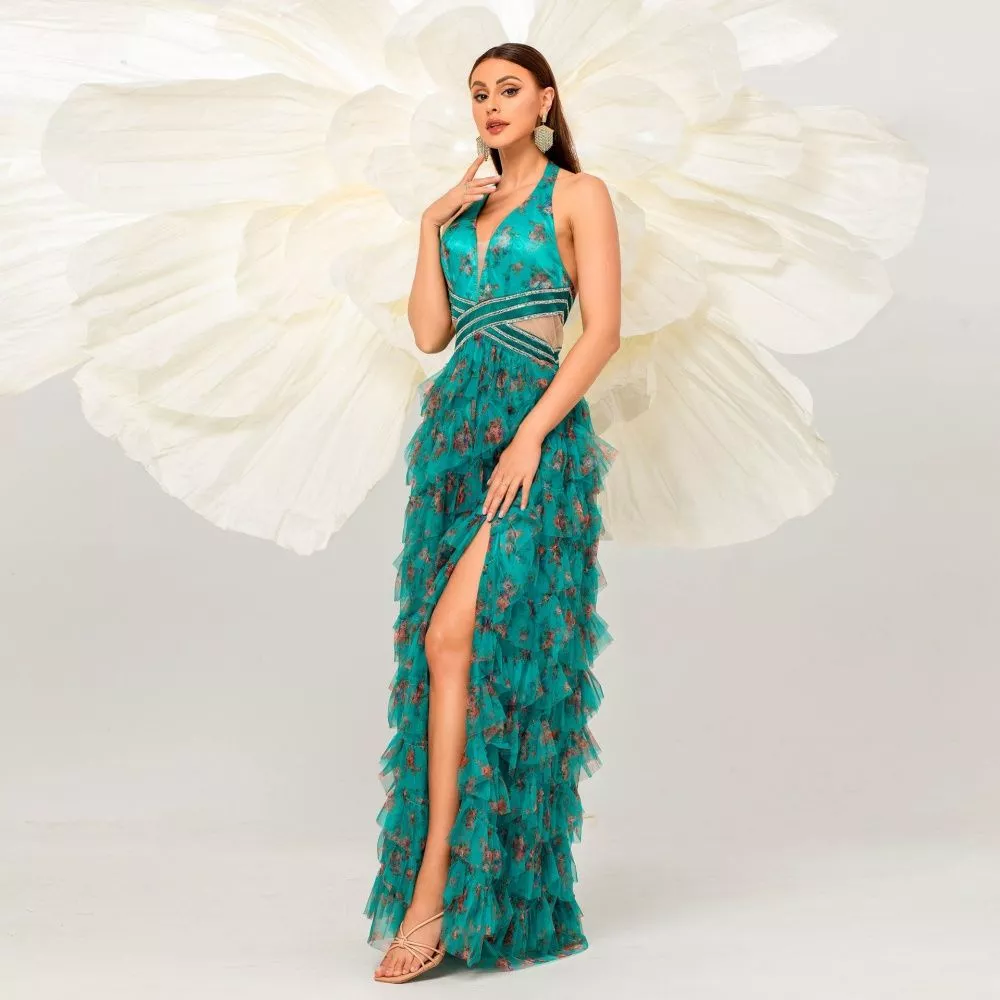 Vestito Abito Elegante Lungo Verde Morbido Raso Strass Sera Evento 25038
