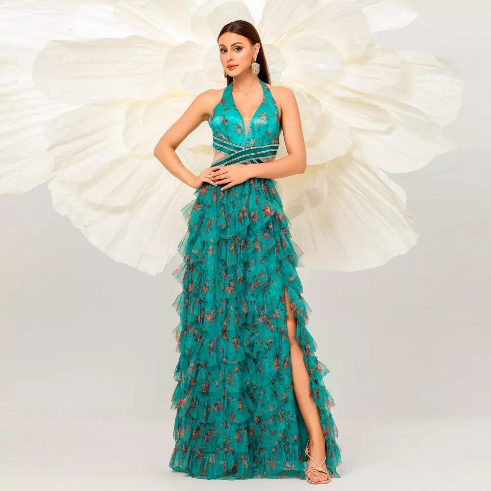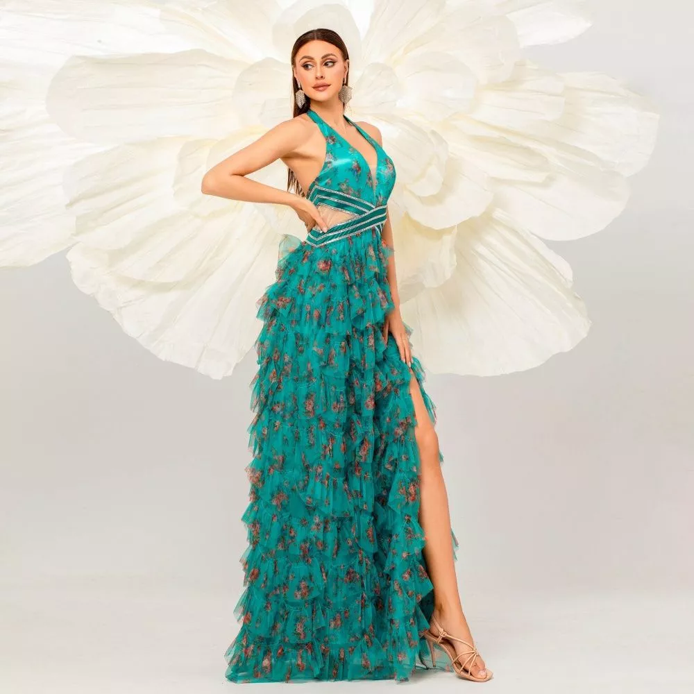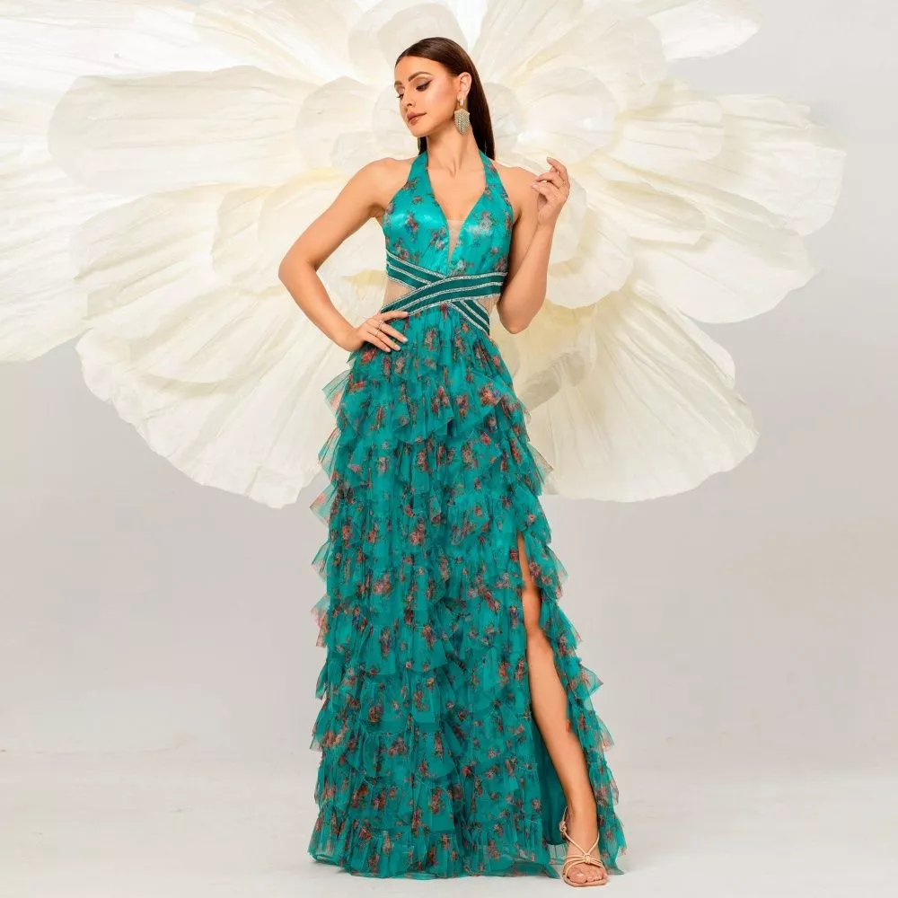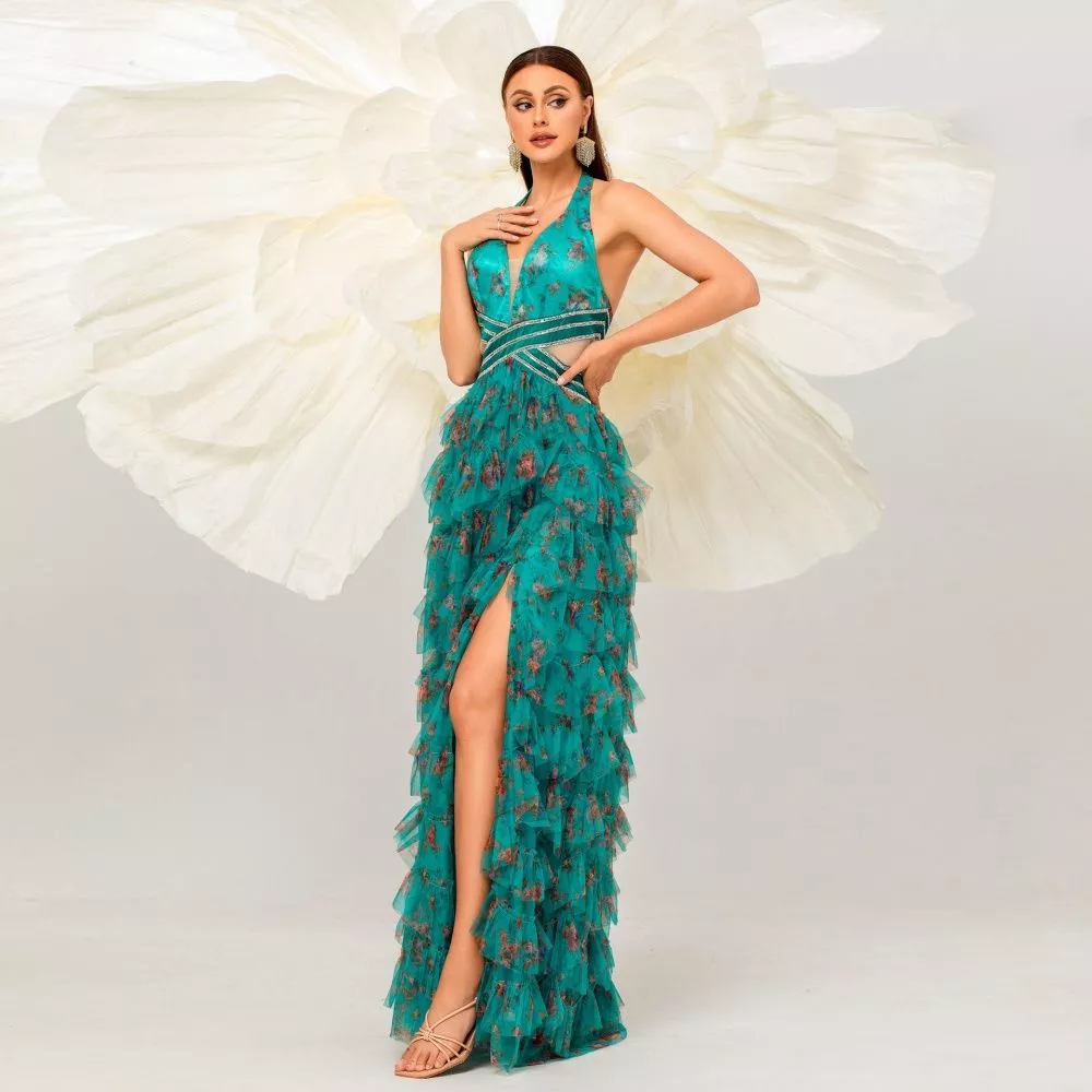 Vestito Abito Elegante Lungo Verde Morbido Raso Strass Sera Evento 25038