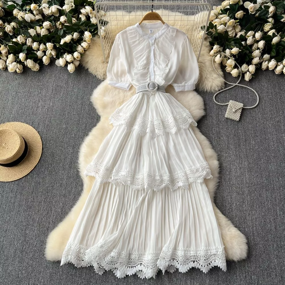 Vestito Abito Leggero Lungo Estivo Cintura Bianco Maniche Corte 10175