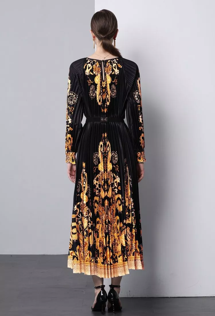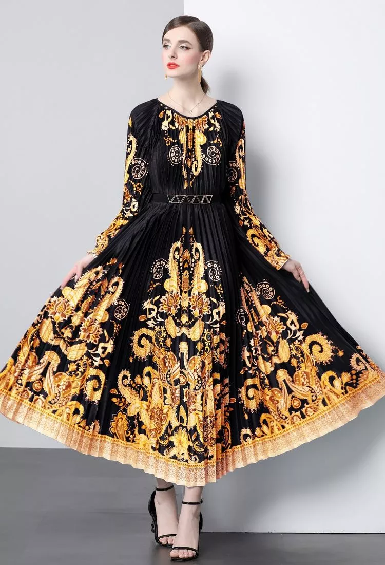 Vestito Abito Lungo Scamiciato Bohoo Morbido Nero Oro Cintura GIPSY 13368