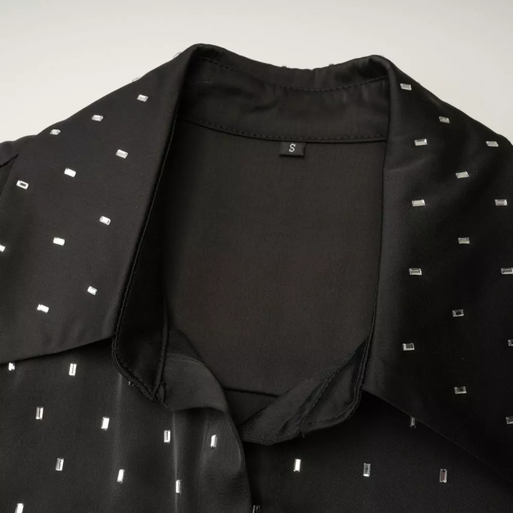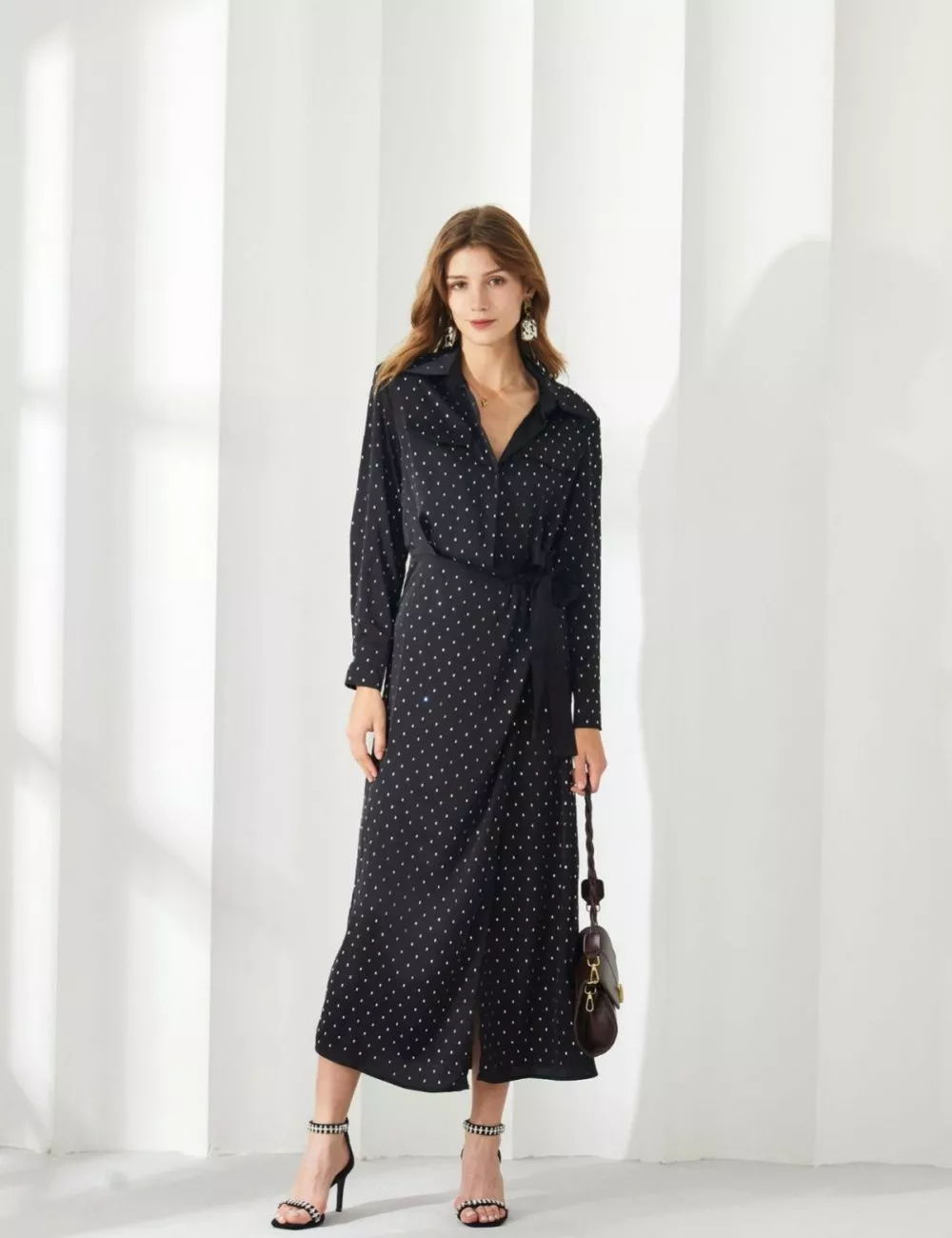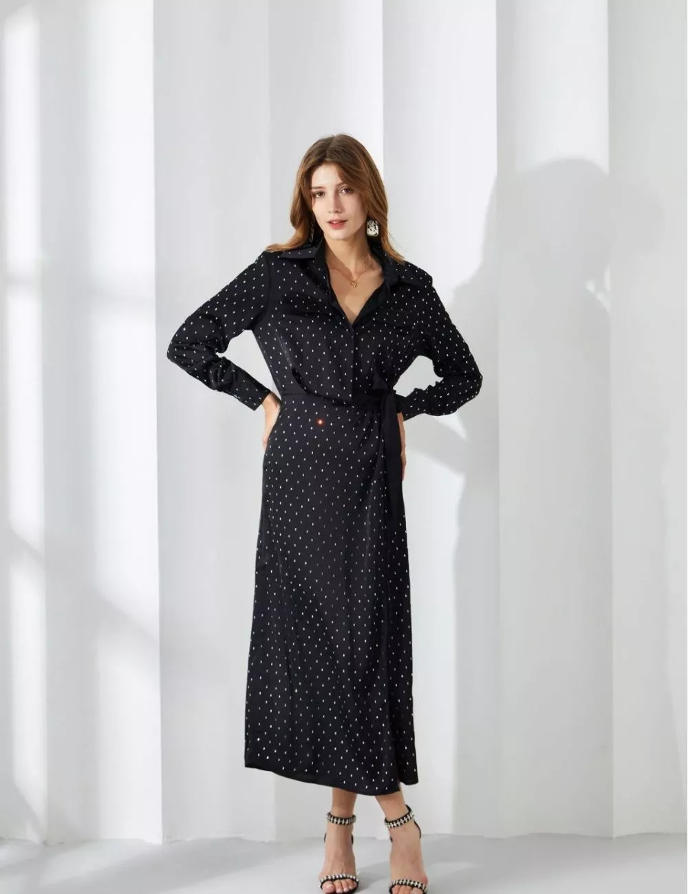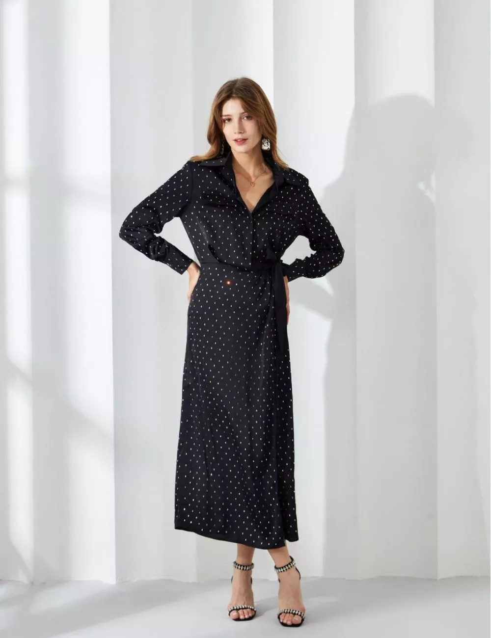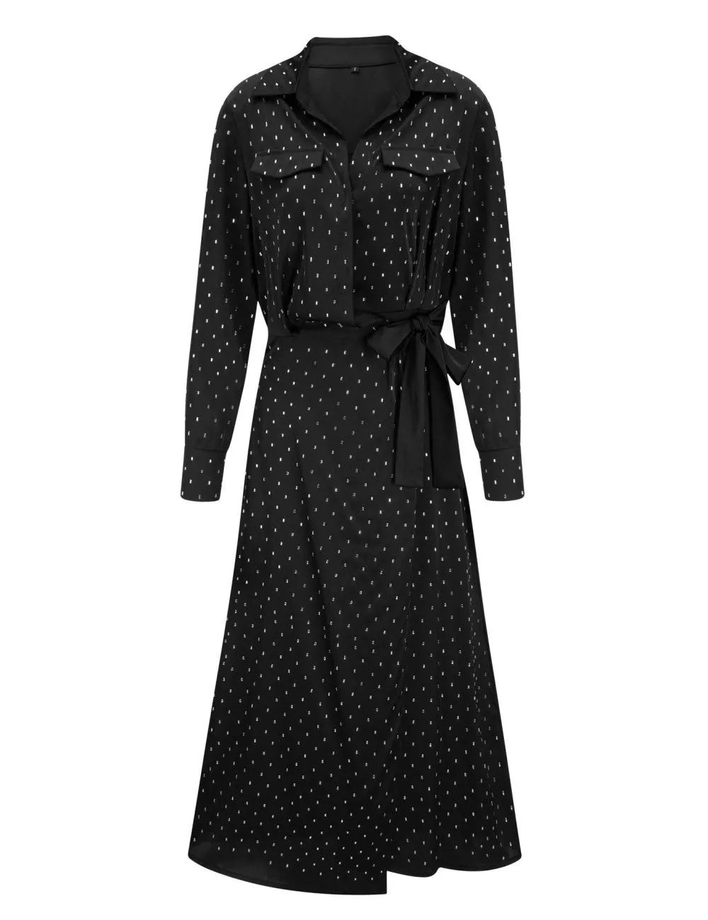 Vestito Abito Lungo Scamiciato Bohoo Nero Pois Beige Cintura Elegante 05905