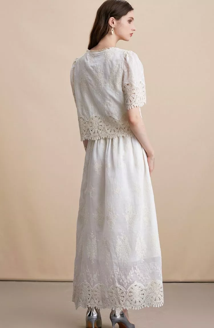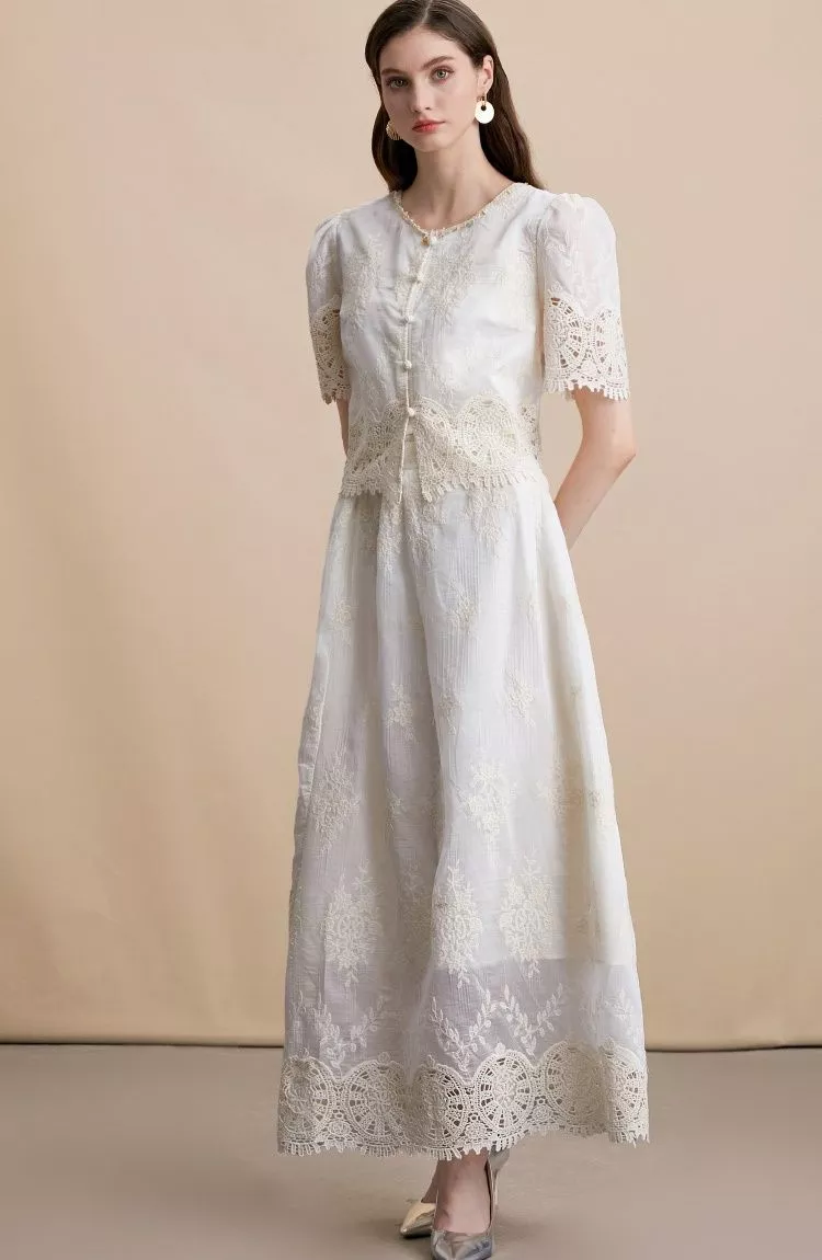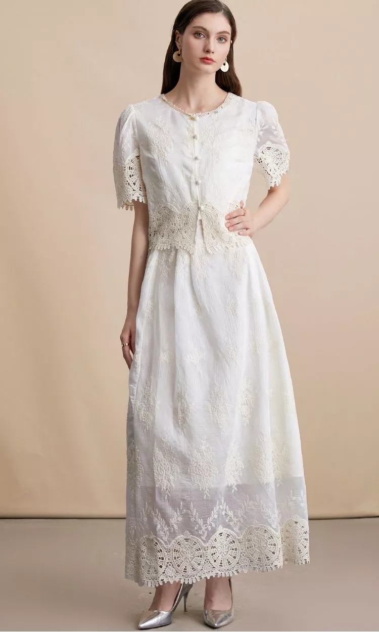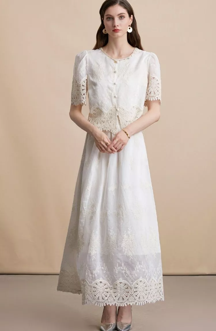 Questo vestito albicocca ricamato è un set sofisticato a due pezzi che unisce un gilet con bottoncini e maniche corte in pizzo a una lunga gonna midi dal taglio elegante. I ricami floreali e il delicato bordo in pizzo rendono il completo perfetto per cerimonie, eventi e ricevimenti speciali. La vita segnata e la linea dritta slanciano la figura, donando uno stile romantico e raffinato pensato per chi cerca un look distinto e femminile.