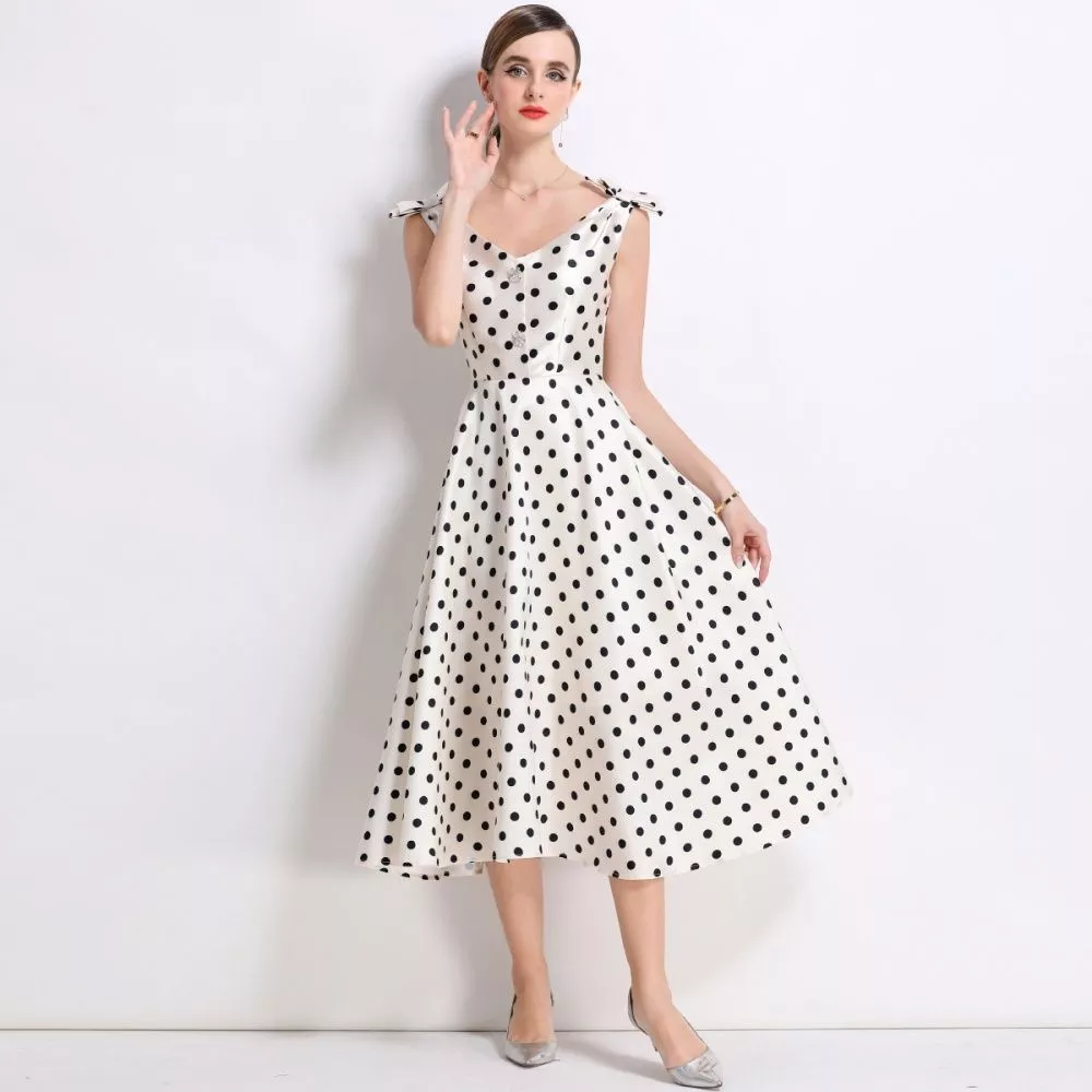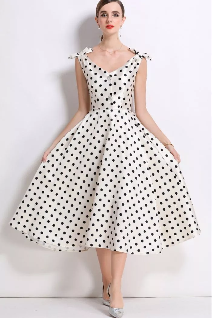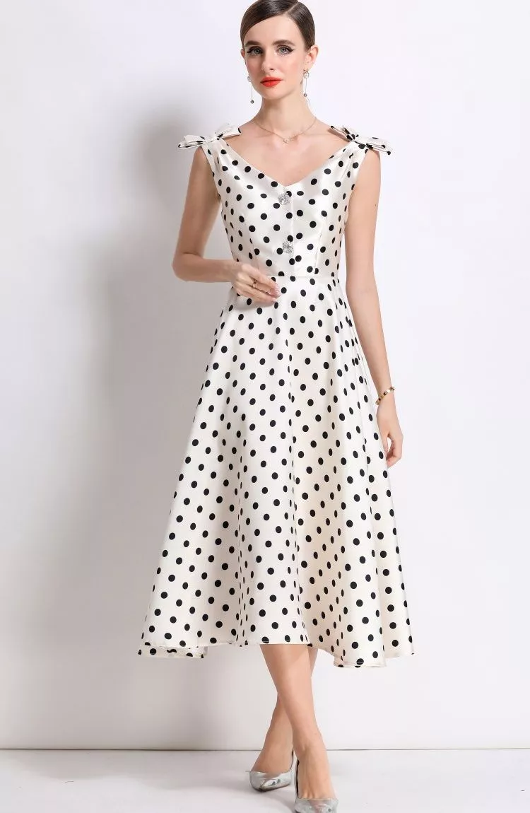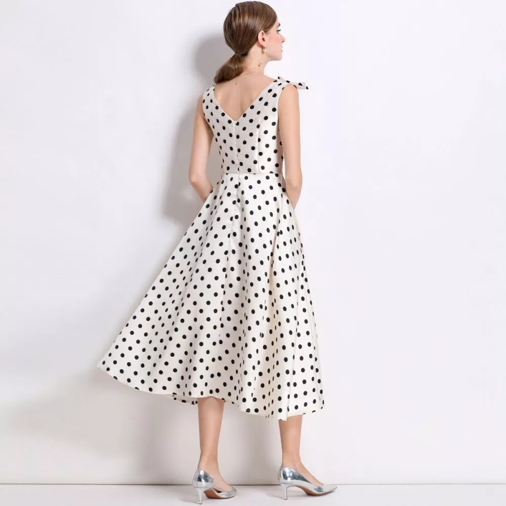Raffinato vestito avorio con stampa a pois neri e fiocchi decorativi sulle spalle, ispirato allo stile bon ton più intramontabile.