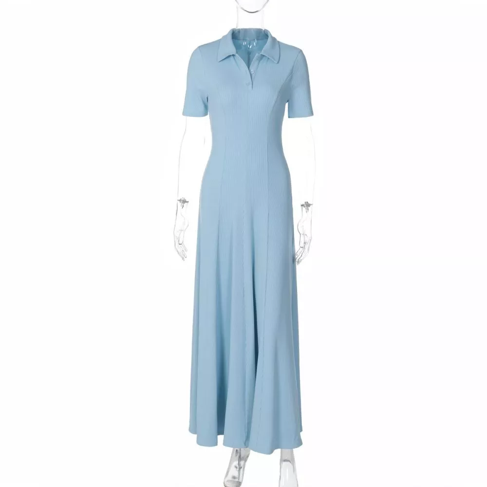 Elegante e versatile, questo vestito lungo con colletto camicia e maniche corte unisce comfort e raffinatezza. Il taglio svasato valorizza la silhouette, mentre i colori bianco, grigio e azzurro lo rendono ideale per cerimonie, feste estive o look casual chic. Un capo intramontabile che unisce praticità e stile in ogni occasione.
