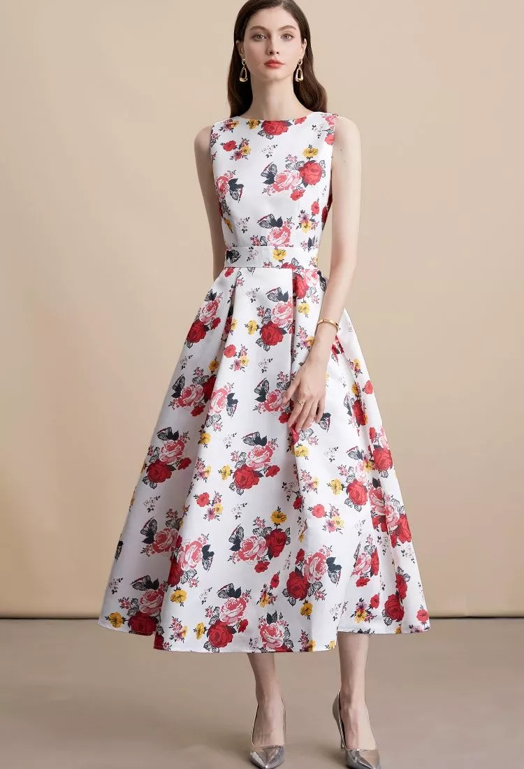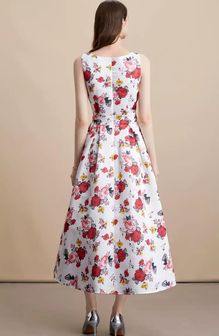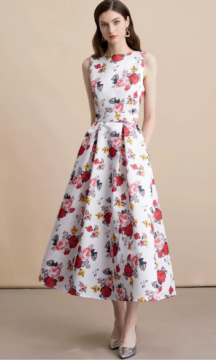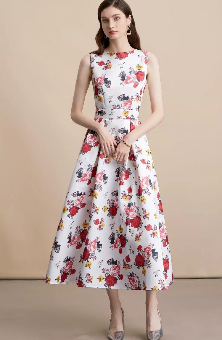 Un vestito raffinato e femminile, ideale per cerimonie, matrimoni ed eventi speciali. Il modello senza maniche con scollo rotondo unisce sobrietà e stile, mentre la vita alta con gonna midi a ruota slancia la figura. La fantasia floreale nei toni rosso, rosa e giallo su base bianca trasmette energia e romanticismo, rendendo questo capo la scelta perfetta per distinguersi con classe in ogni occasione.