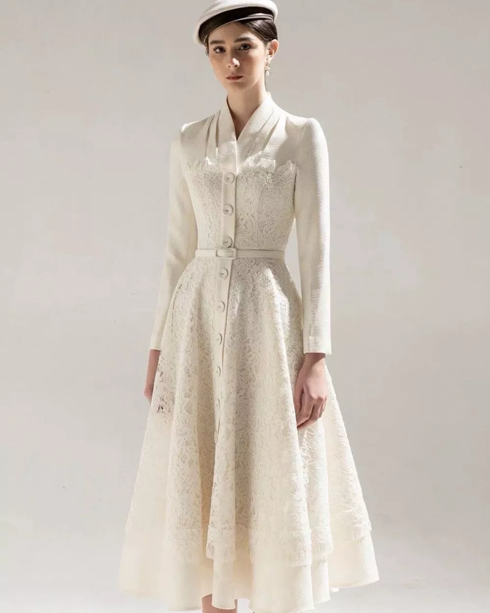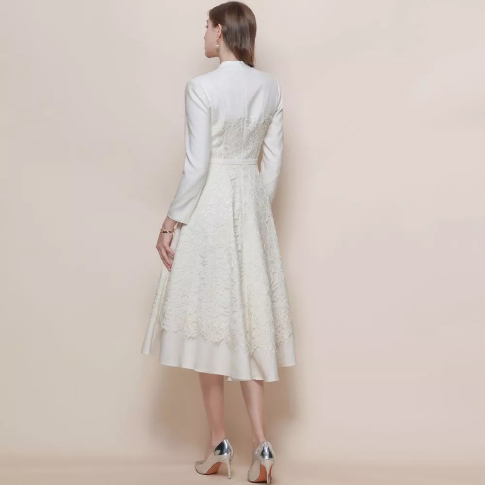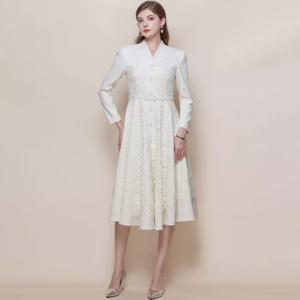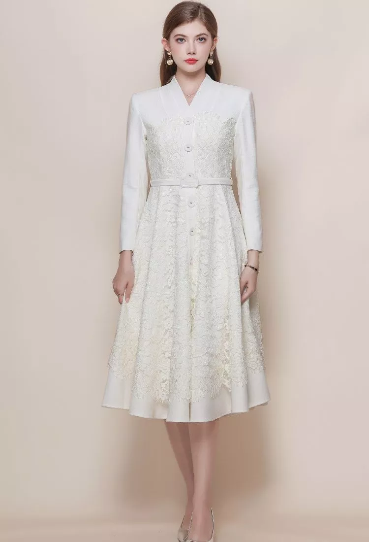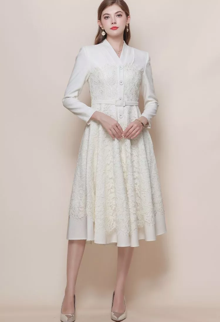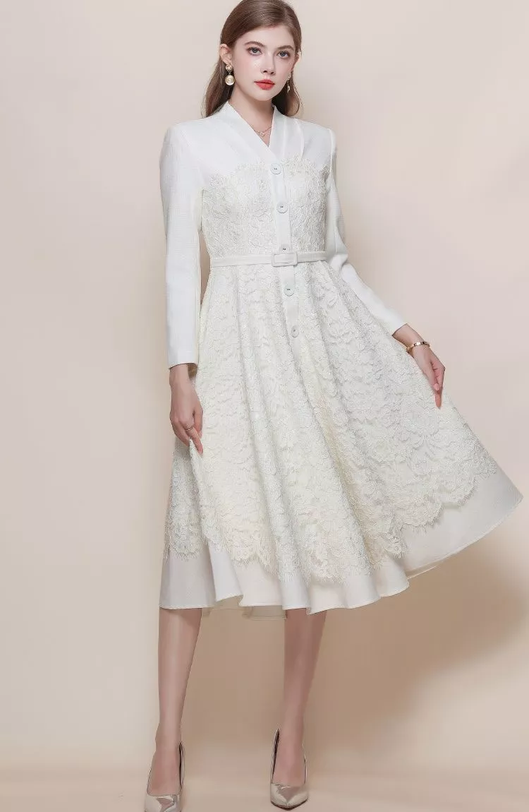 Un vestito raffinato che unisce eleganza francese e delicatezza del pizzo, pensato per valorizzare la figura con una linea armoniosa e femminile. Il corpetto strutturato crea un effetto slanciato, mentre il pizzo ricamato dona luminosità e un tocco romantico. La cintura inserita definisce delicatamente il punto vita, modellando senza rinunciare al comfort.