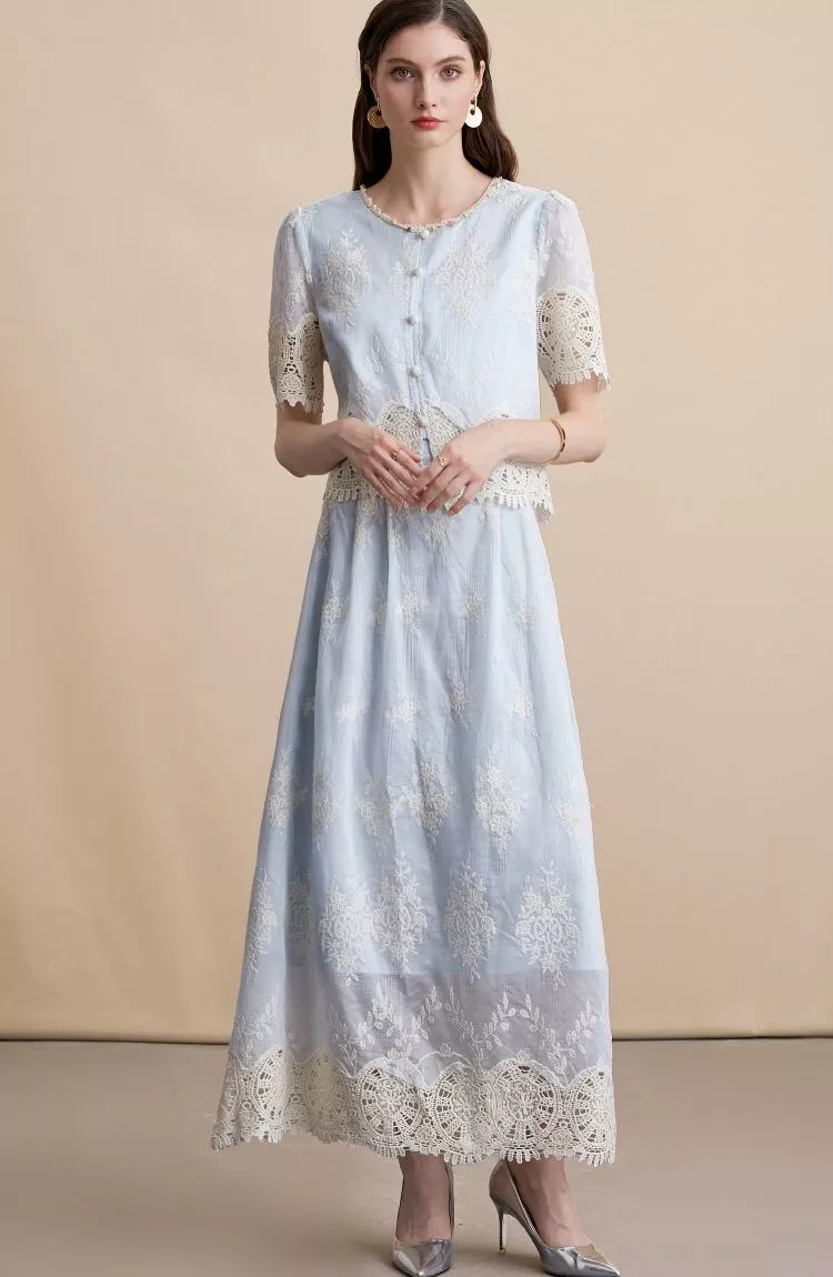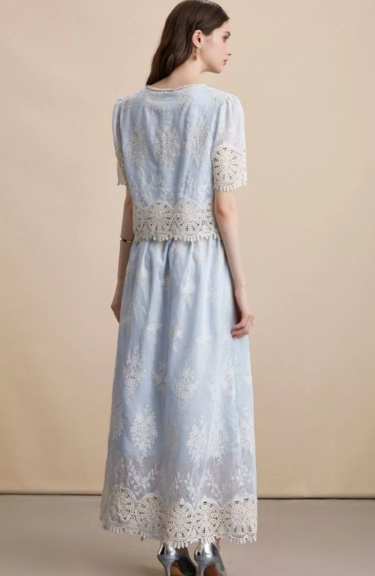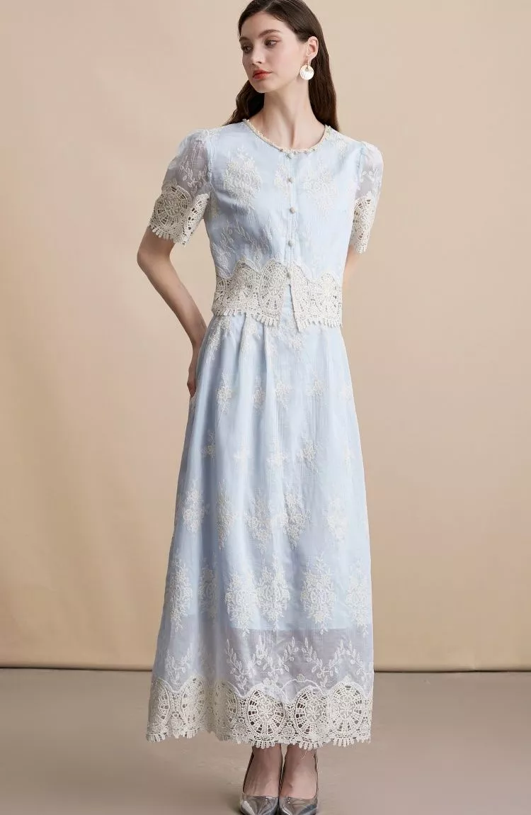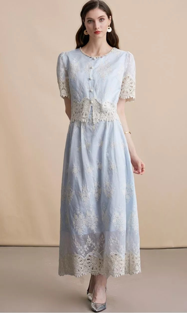 Raffinato e femminile, questo vestito blu ricamato è un set a due pezzi che unisce un gilet con bottoncini frontali e maniche corte in pizzo a una lunga gonna midi dal taglio elegante. Il ricamo floreale e il bordo in pizzo rendono l’outfit perfetto per cerimonie, ricevimenti e occasioni speciali. La vita segnata e la linea dritta valorizzano la silhouette, creando un look romantico e sofisticato, ideale per chi desidera distinguersi con classe.