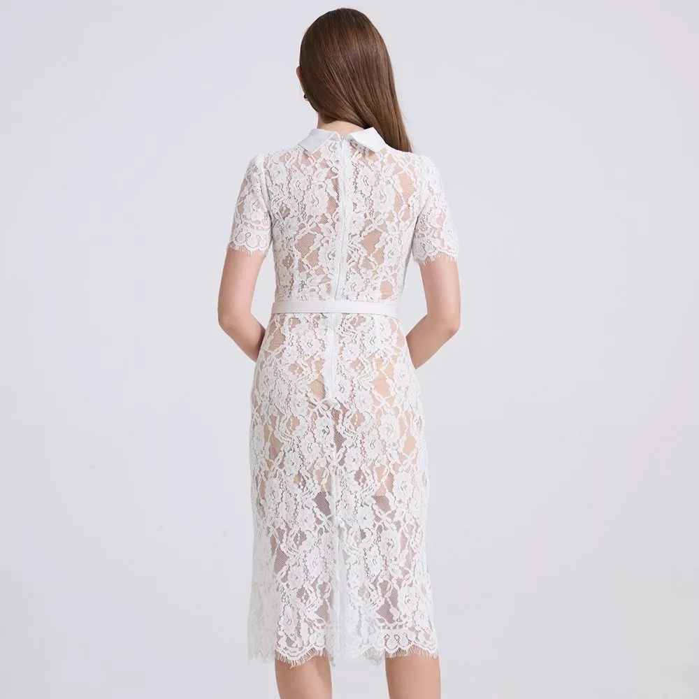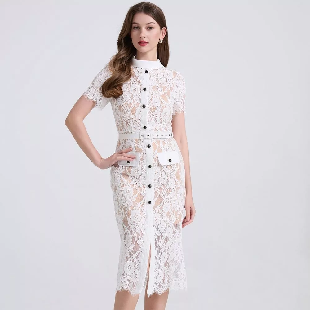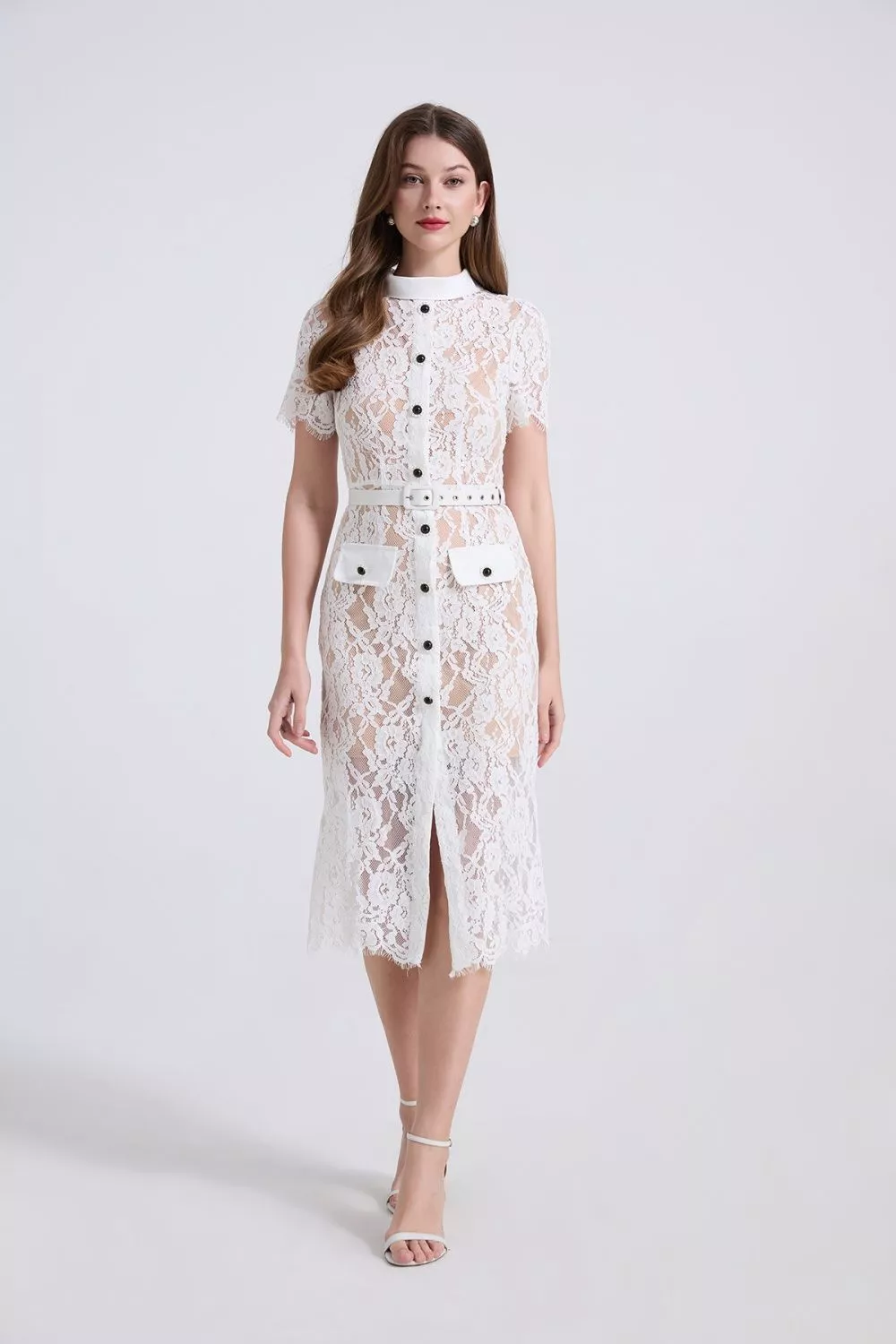 Vestito Cerimonia In Pizzo Con Cintura E Dettagli Bottoni Bianco CF67062