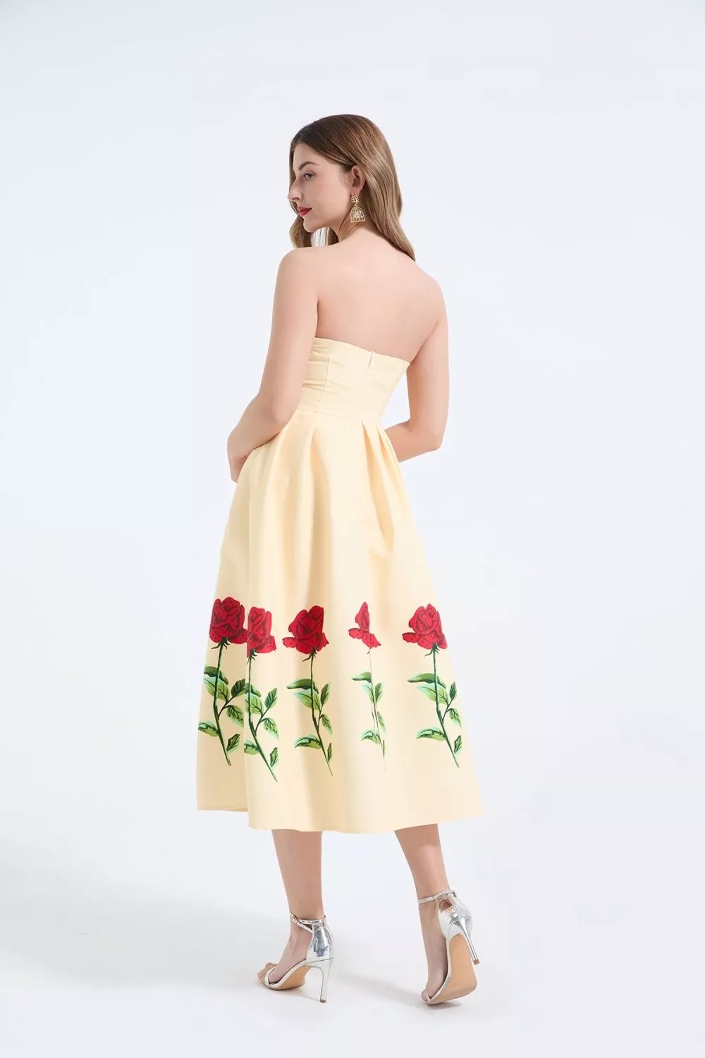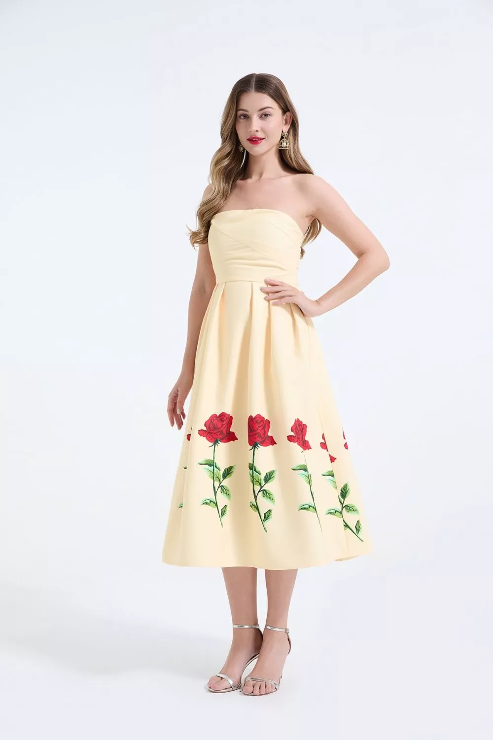 Vestito Cerimonia Midi A Fascia Con Stampa Rose Fondo Giallo CF68244