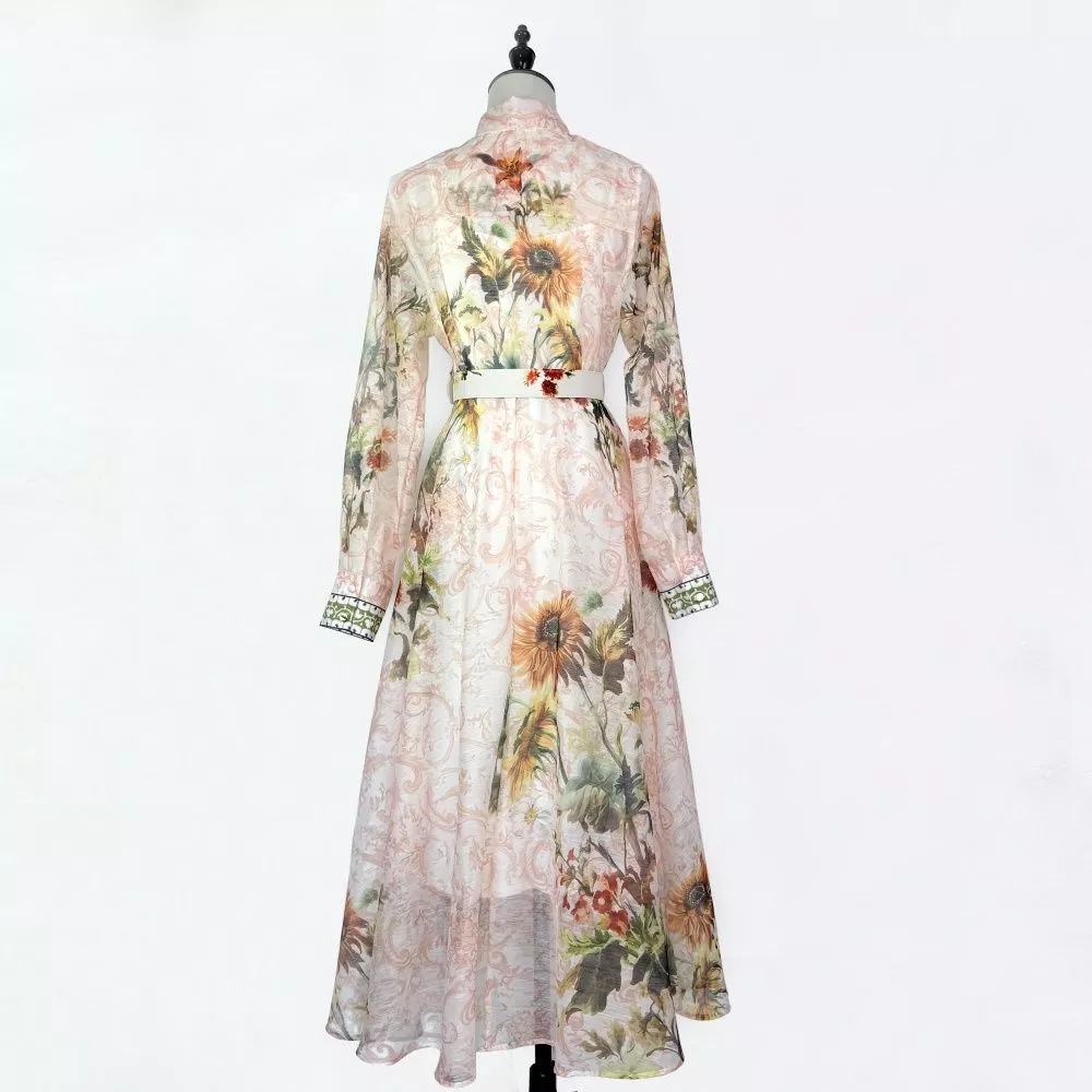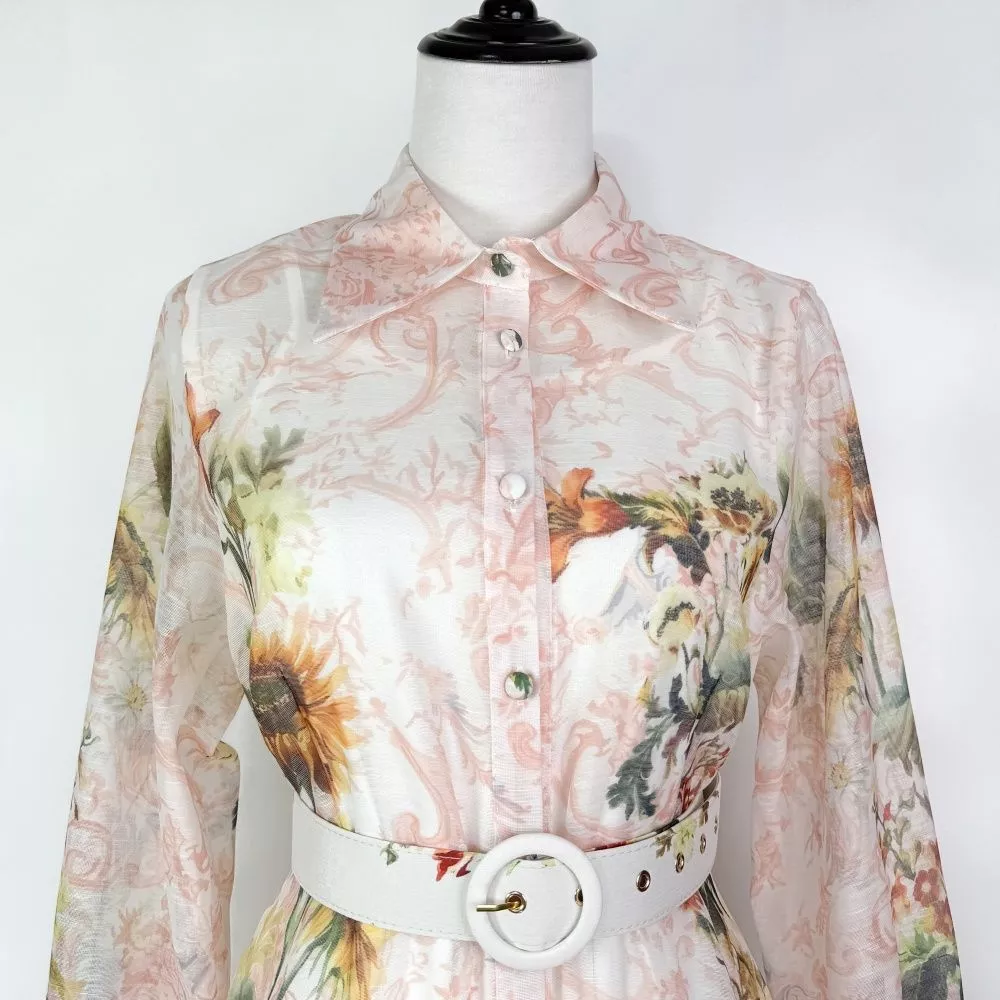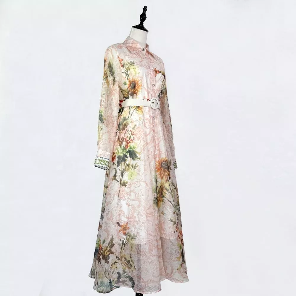 Vestito chemisier lungo dal fascino romantico e sofisticato, perfetto per cerimonie, eventi e look eleganti quotidiani. La stampa floreale effetto acquerello nei toni rosa cipria e verde crea un'estetica raffinata e luminosa, mentre la cintura in vita valorizza la silhouette con equilibrio e femminilità. Il taglio midi fluido e il colletto camicia rendono questo abito ideale sia per occasioni formali sia per outfit chic da giorno.
