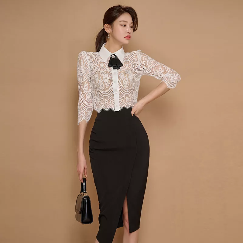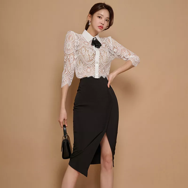 Vestito Completo Donna Set Tailleur Camicia Gonna Tubino Bianco Nero 58565