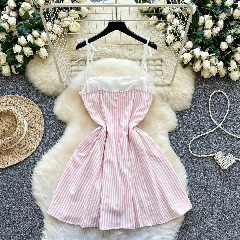 Vestito Corto A Righe Con Inserto Pizzo E Fiocchi Rosa Cipria Mini CF67777