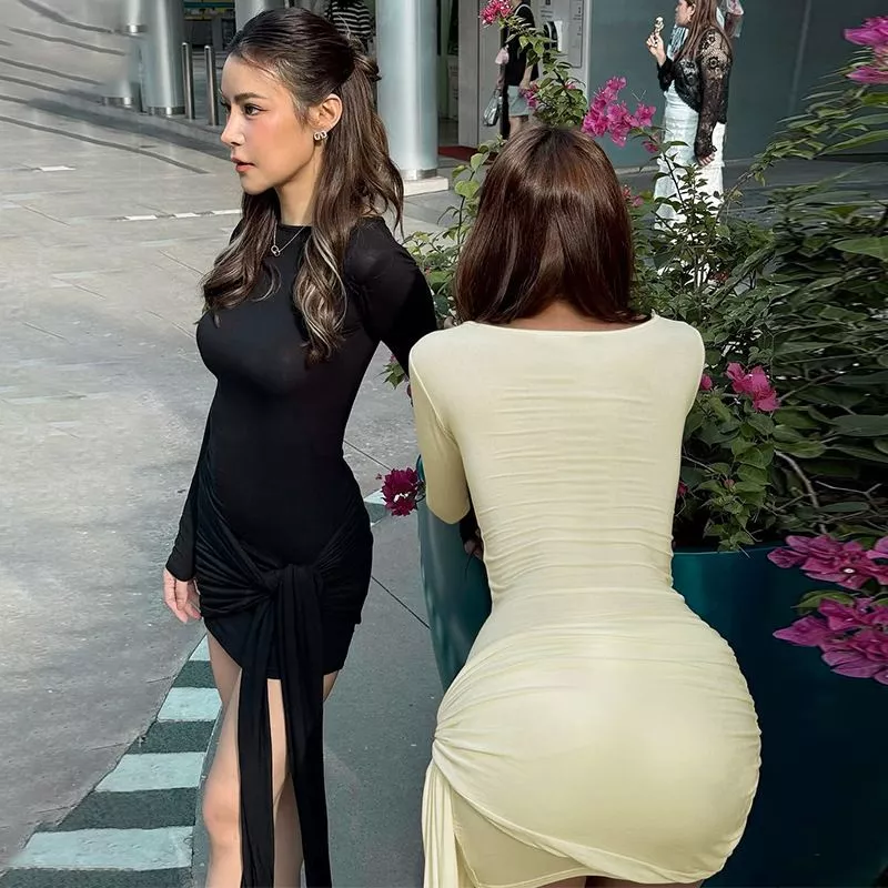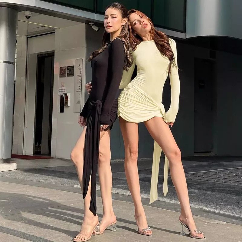 Un abito che non passa inosservato: questo vestito corto aderente con maniche lunghe esalta la silhouette grazie al drappeggio laterale annodato che dona un tocco sensuale e moderno. Perfetto per party, uscite serali ed eventi glamour, si distingue per la vestibilità slim e lo stile grintoso. Indossalo con tacchi alti e pochette elegante per un look che cattura lo sguardo.