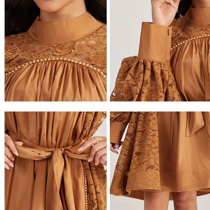 Il design svasato e la cintura coordinata valorizzano la vita, mentre i dettagli in pizzo sulle maniche e sul corpino aggiungono un tocco romantico e femminile.