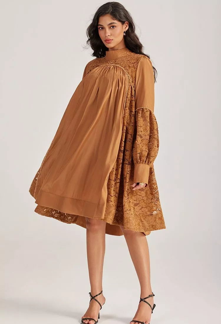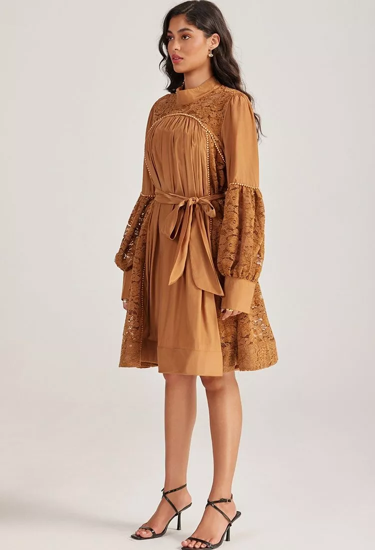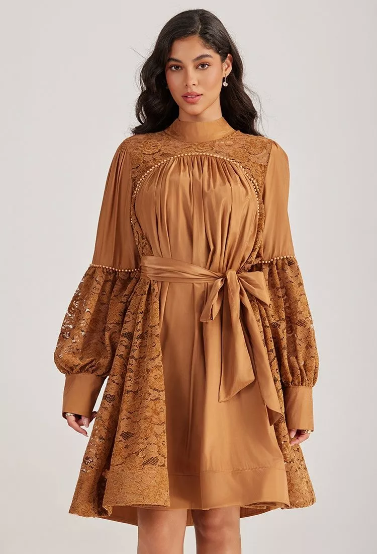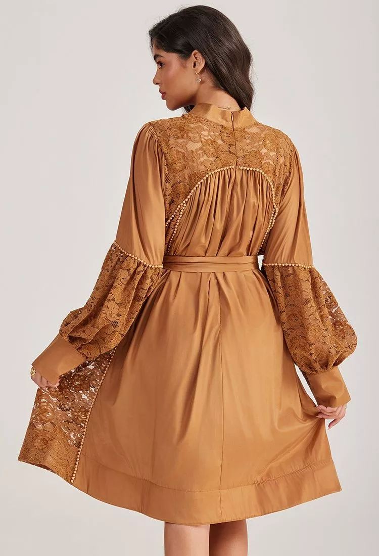 Vestito Corto Cammello In Pizzo Con Maniche Lunghe E Fiocco CF55507