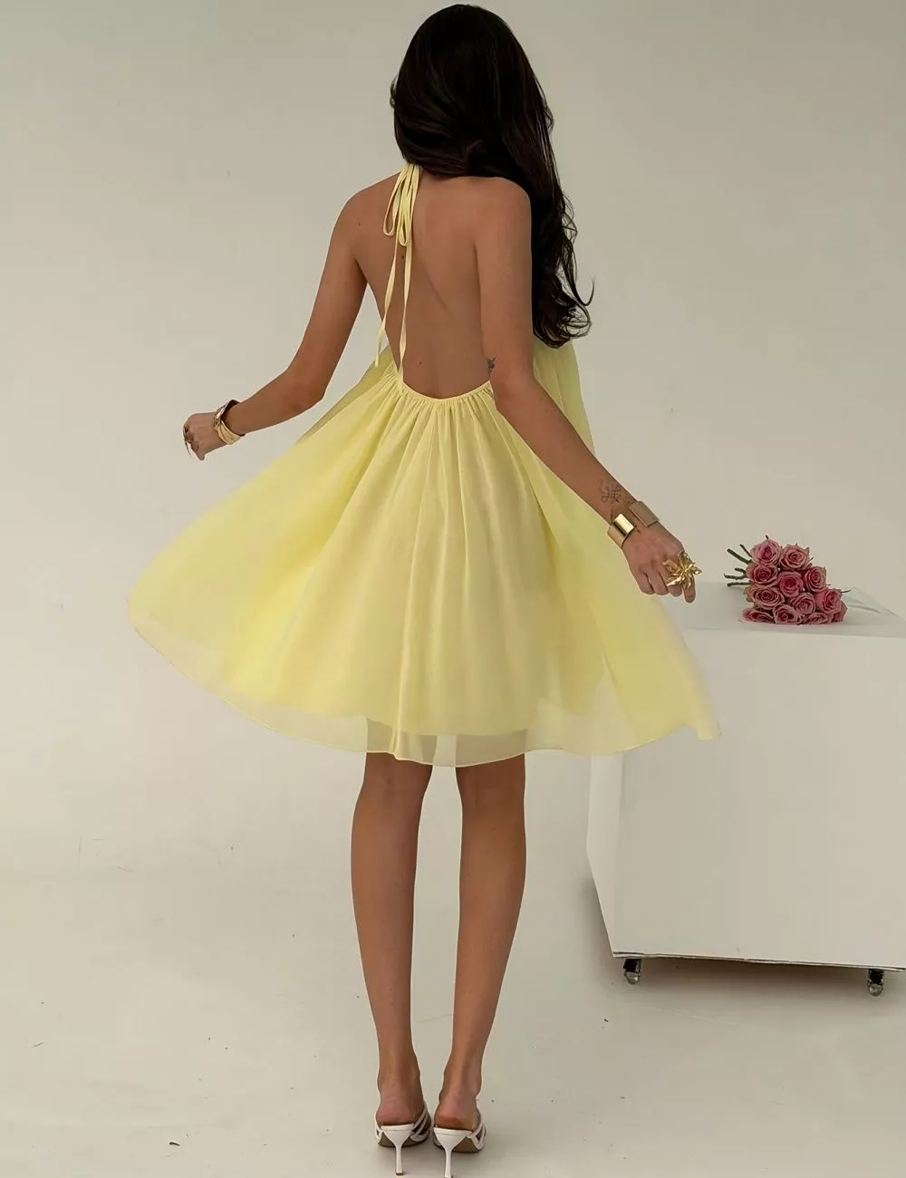 Vestito Corto Donna Halter Giallo Schiena Scoperta e Dettaglio Metallo CF70667
