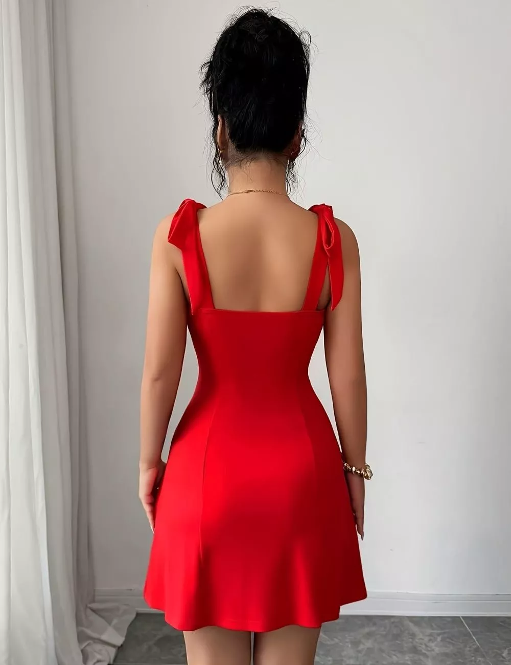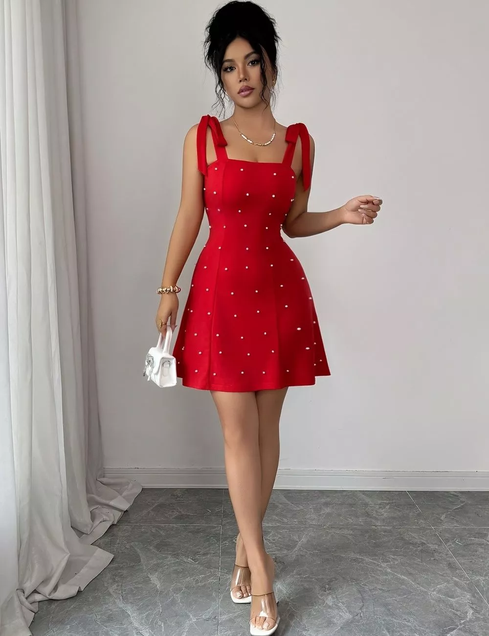 Vestito corto donna in tonalità rosso acceso, progettato per valorizzare la silhouette con una linea aderente e femminile. Il design con applicazioni di perle aggiunge luminosità e dettaglio, mentre le spalline con fiocco donano un tocco distintivo e moderno. La gonna leggermente svasata crea equilibrio e movimento, rendendo questo abito perfetto per outfit eleganti, serate e occasioni speciali.