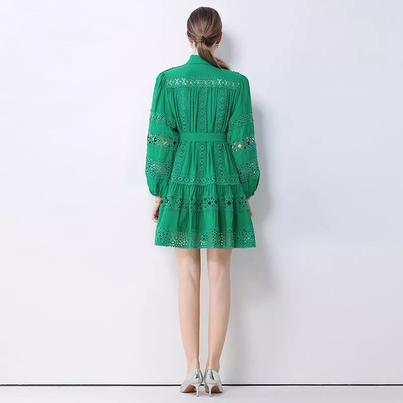 Vestito Corto Elegante Con Cintura In Pizzo Traforato Manica Lunga Verde CF68671